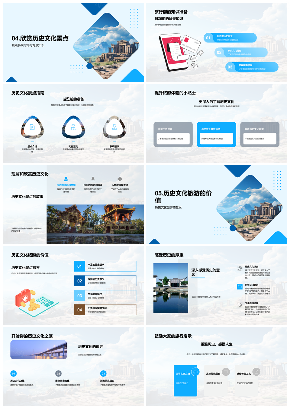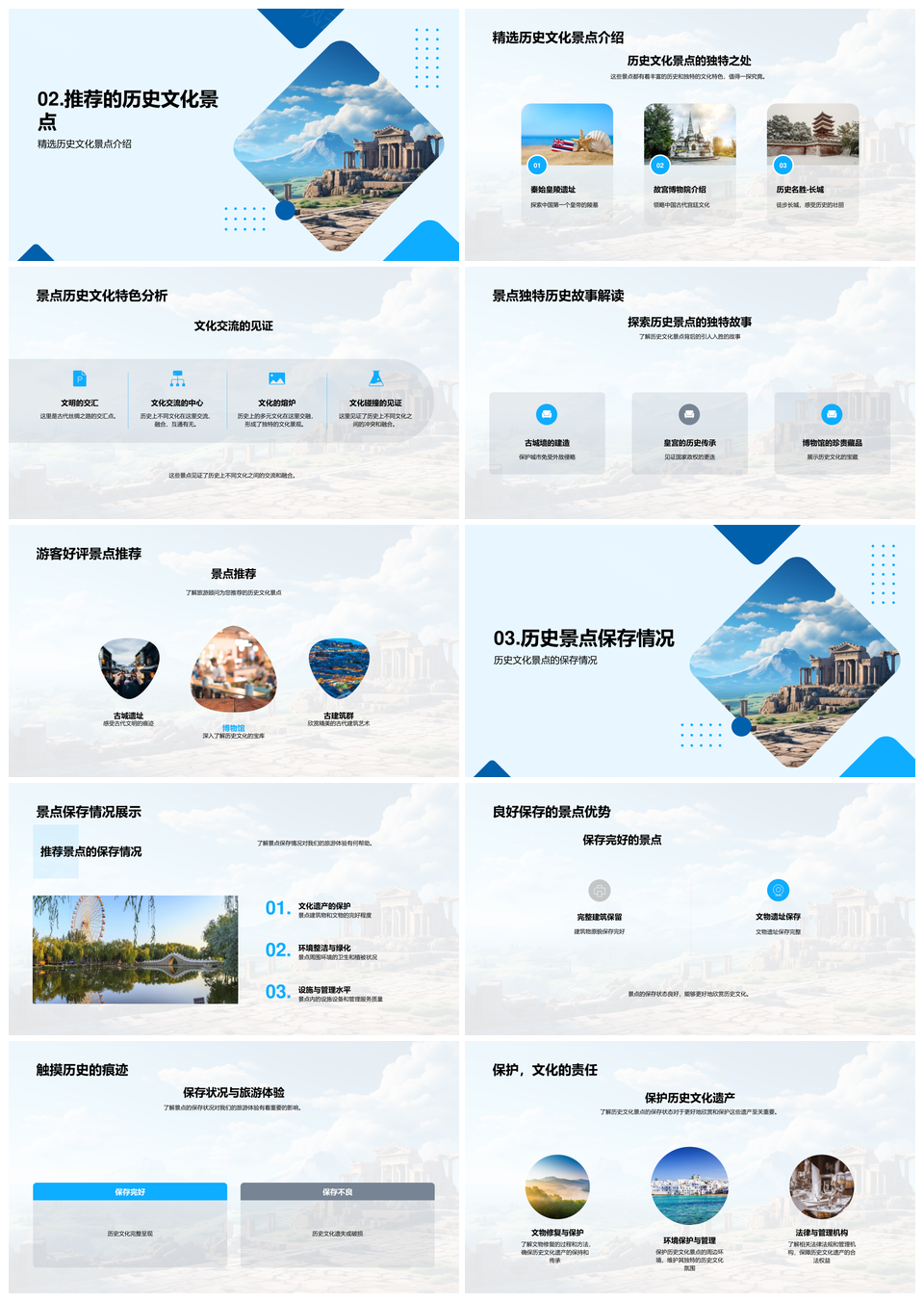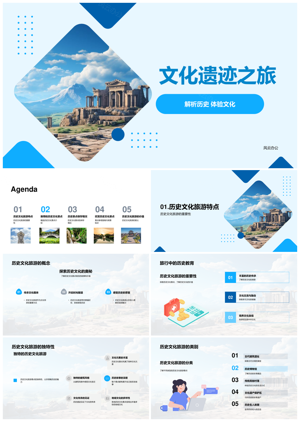 风云办公提供的历史文化遗迹保存与独特游览指南PPT模板,下载格式为pptx,一共28页,作品中文字及图均可以修改和编辑,图片更改请在作品中右键图片并更换,文字修改请直接点击文字进行修改。