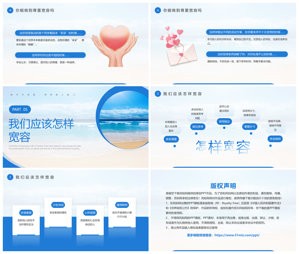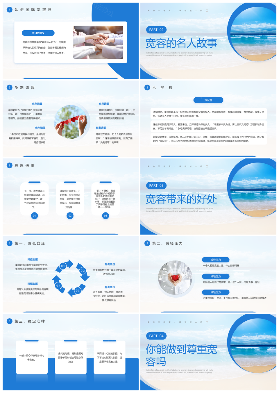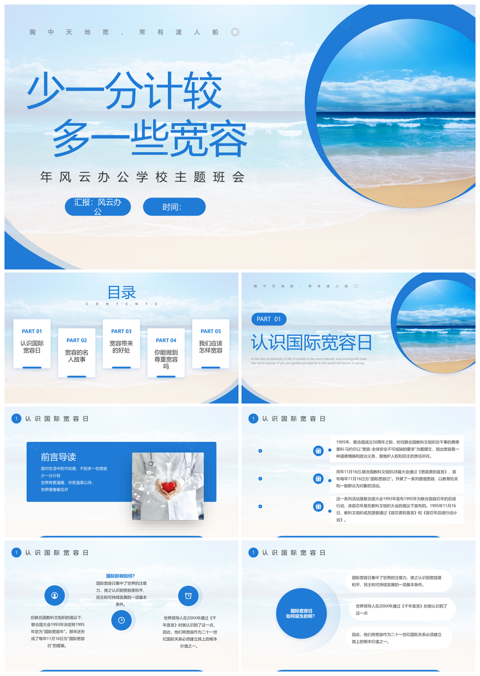 风云办公提供的国际宽容日学会宽容蓝调简约班会PPT模板,下载格式为pptx,一共24页,作品中文字及图均可以修改和编辑,图片更改请在作品中右键图片并更换,文字修改请直接点击文字进行修改。