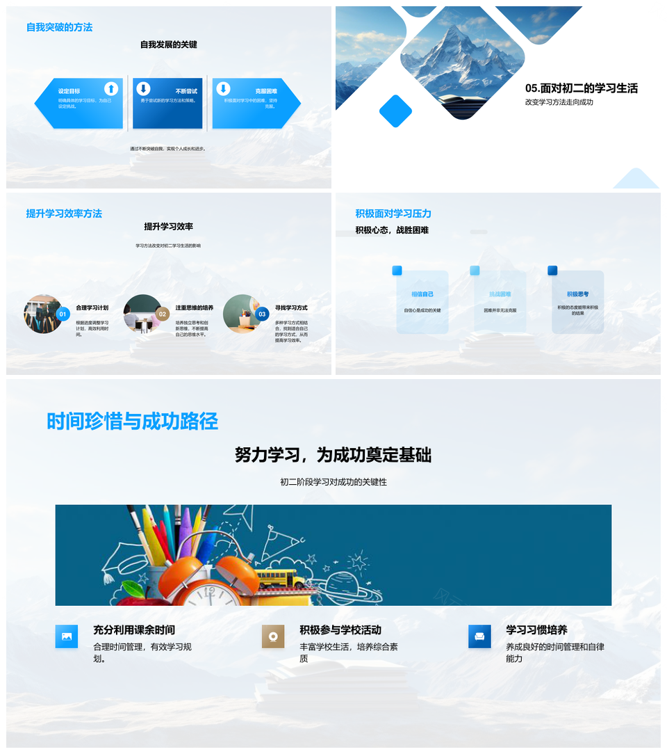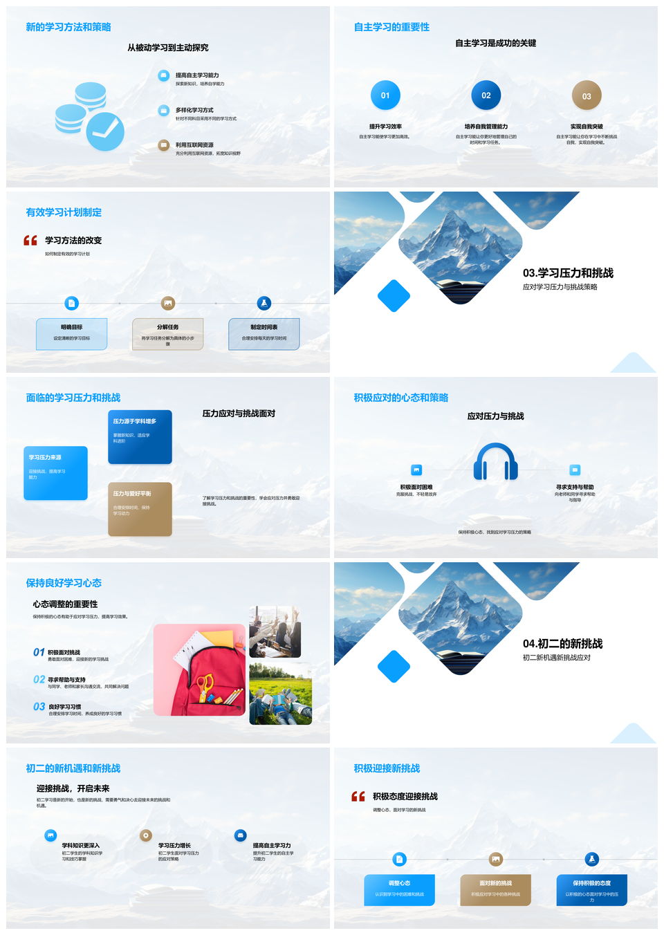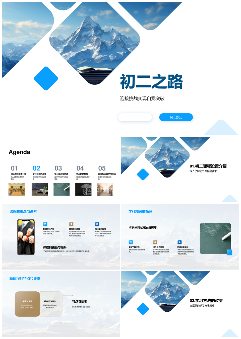 风云办公提供的初二进阶拓宽自主计划迎挑战PPT模板,下载格式为pptx,一共23页,作品中文字及图均可以修改和编辑,图片更改请在作品中右键图片并更换,文字修改请直接点击文字进行修改。