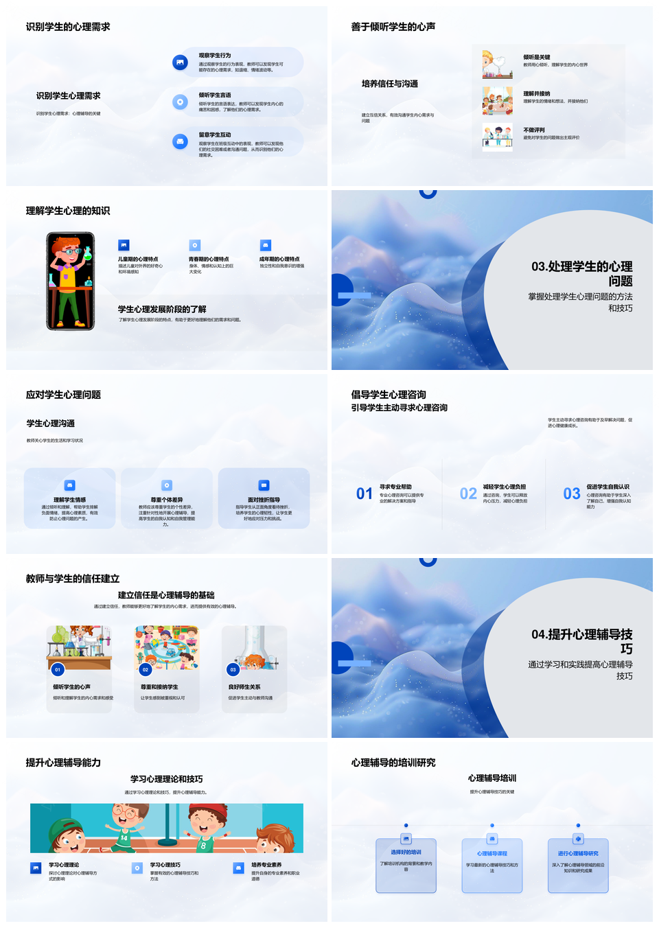风云办公提供的教师心理辅导技巧培训与学生心理需求PPT模板,下载格式为pptx,一共23页,作品中文字及图均可以修改和编辑,图片更改请在作品中右键图片并更换,文字修改请直接点击文字进行修改。