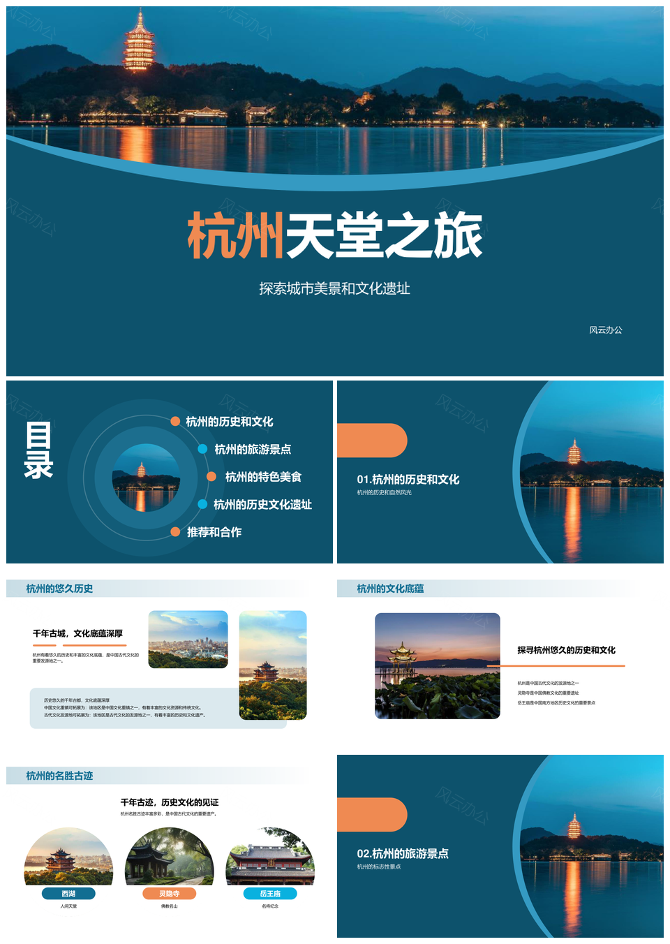 风云办公提供的蓝色苏杭旅游城市印象天堂美景美食PPT模板,下载格式为pptx,一共21页,作品中文字及图均可以修改和编辑,图片更改请在作品中右键图片并更换,文字修改请直接点击文字进行修改。
