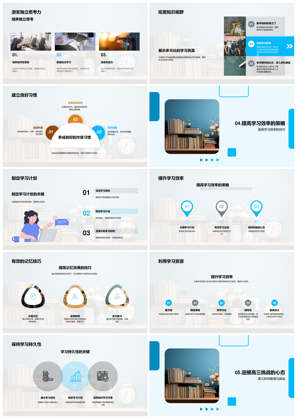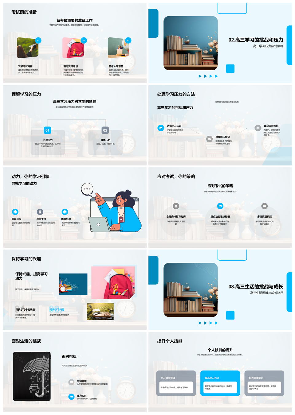 风云办公提供的高三挑战高效学习积极心态成长之路PPT模板,下载格式为pptx,一共33页,作品中文字及图均可以修改和编辑,图片更改请在作品中右键图片并更换,文字修改请直接点击文字进行修改。
