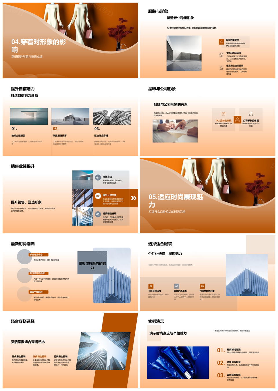 风云办公提供的时尚潮流穿搭艺术与商务形象技巧PPT模板,下载格式为pptx,一共28页,作品中文字及图均可以修改和编辑,图片更改请在作品中右键图片并更换,文字修改请直接点击文字进行修改。