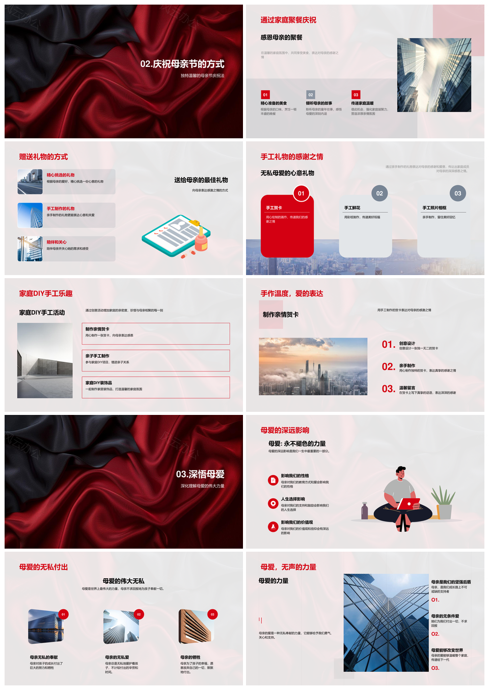 这是一张母亲节母爱感恩家庭手作礼庆PPT模板,包含母亲节、母爱、感恩、家庭、手作、礼庆等主题内容,也可用作母亲节母爱感恩家庭、母亲节母爱感恩手作、母亲节母爱感恩礼庆、母亲节母爱家庭手作、母亲节母爱家庭礼庆、母亲节母爱手作礼庆、母爱感恩家庭手作、母爱感恩家庭礼庆、母爱感恩手作礼庆、母爱家庭手作礼庆、感恩家庭手作礼庆、母亲节家庭手作礼庆、母亲节手作礼庆、家庭手作礼庆、手作礼庆等PPT场景使用。
