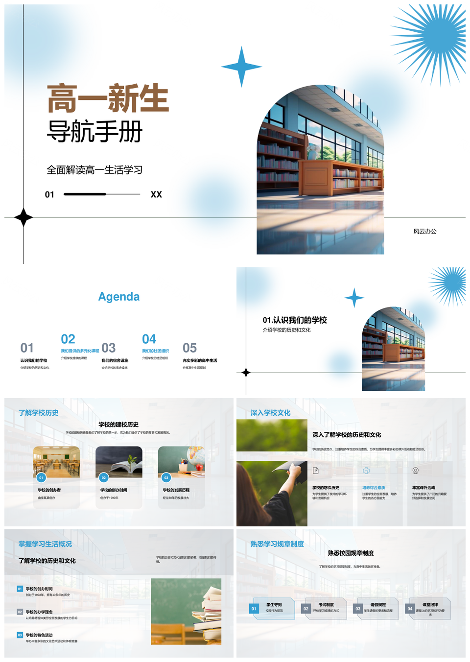 风云办公提供的高一新生手册校史宿舍社团大楼指南PPT模板,下载格式为pptx,一共26页,作品中文字及图均可以修改和编辑,图片更改请在作品中右键图片并更换,文字修改请直接点击文字进行修改。