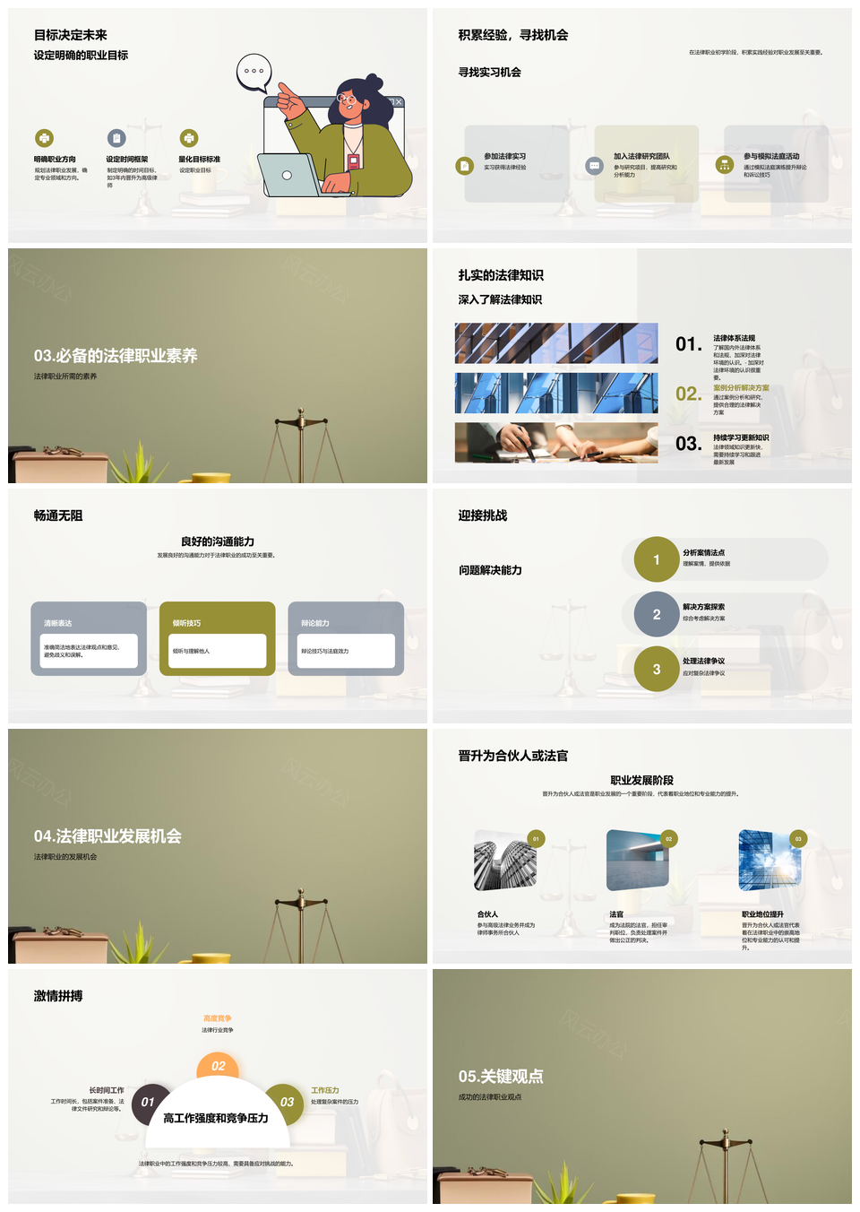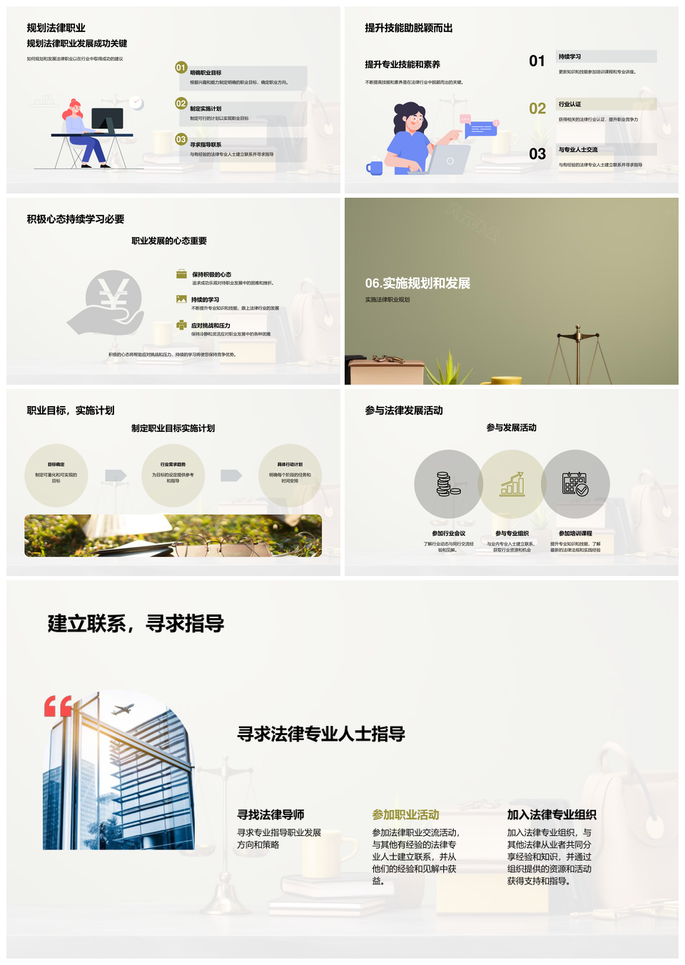 这是一张法律初学者职业规划与发展阶段专业技能PPT模板,包含法律初学者、职业规划、发展阶段、专业技能等主题内容,也可用作法律初学者职业规划发展、法律职业规划发展阶段、初学者职业规划发展阶段、职业规划发展阶段专业技能、法律初学者职业规划、法律职业规划发展、职业规划发展阶段、发展阶段专业技能、职业规划发展专业技能、初学者职业规划发展、法律初学者、职业规划发展、发展阶段、职业规划专业技能、发展专业技能等PPT场景使用。 风云办公提供的法律初学者职业规划与发展阶段专业技能PPT模板,下载格式为pptx,一共25页,作品中文字及图均可以修改和编辑,图片更改请在作品中右键图片并更换,文字修改请直接点击文字进行修改。