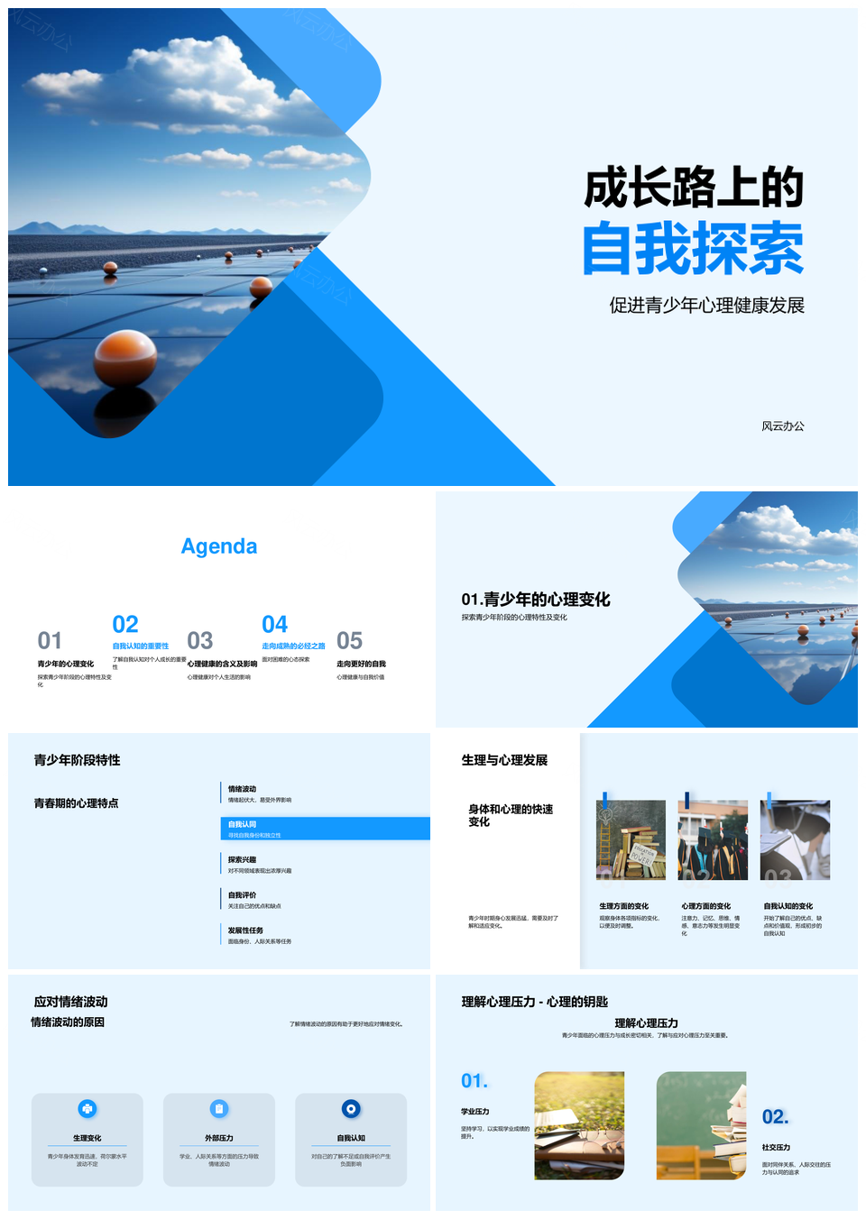 风云办公提供的青少年心理健康成长与自我探索之路PPT模板,下载格式为pptx,一共28页,作品中文字及图均可以修改和编辑,图片更改请在作品中右键图片并更换,文字修改请直接点击文字进行修改。