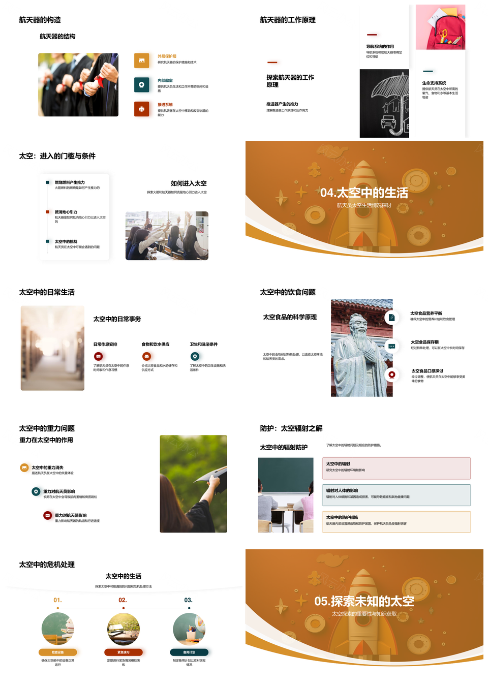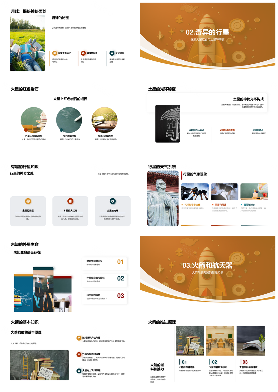 这是一张太阳系探秘航天员火箭地球火星红岩土星环PPT模板,包含太阳系、探秘、航天员、火箭、地球、火星、红壤、土星环等主题内容,也可用作太阳系探秘航天员火箭、航天员探秘太阳系火星、探秘火星红岩土星环、地球火星红岩土星环、航天员火箭地球火星、太阳系探秘航天员、探秘太阳系土星环、航天员探秘火星、火星红岩土星环、太阳系地球火星、火箭地球火星、航天员火箭地球、太阳系探秘、地球火星、航天员火箭等PPT场景使用。 风云办公提供的太阳系探秘航天员火箭地球火星红岩土星环PPT模板,下载格式为pptx,一共33页,作品中文字及图均可以修改和编辑,图片更改请在作品中右键图片并更换,文字修改请直接点击文字进行修改。