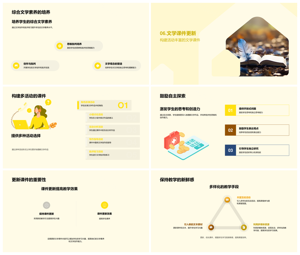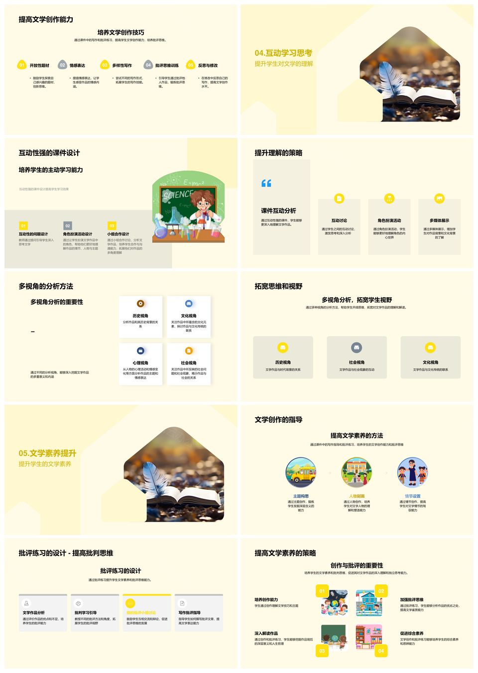 风云办公提供的文学多维互动课件激发创作批评思维PPT模板,下载格式为pptx,一共34页,作品中文字及图均可以修改和编辑,图片更改请在作品中右键图片并更换,文字修改请直接点击文字进行修改。