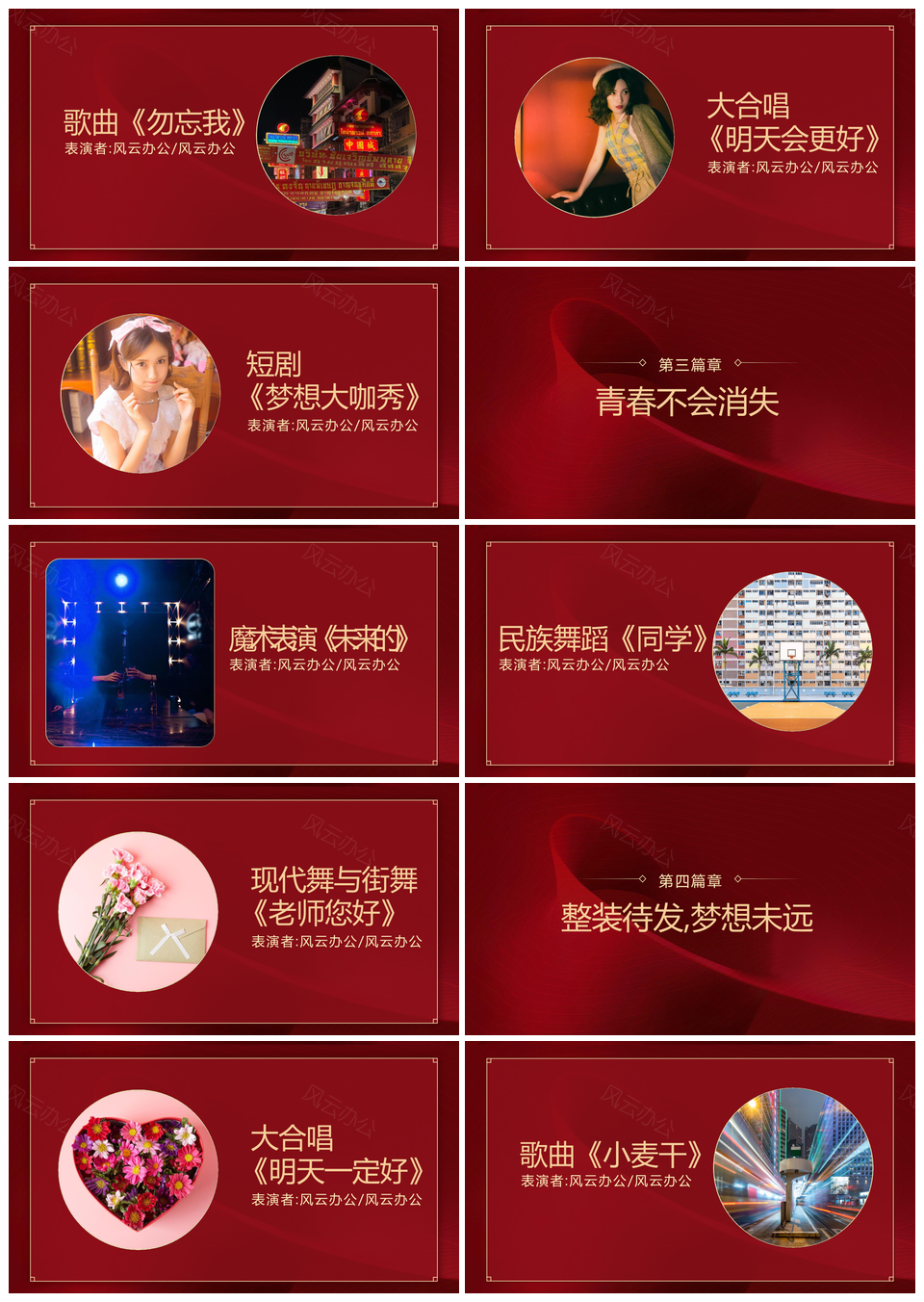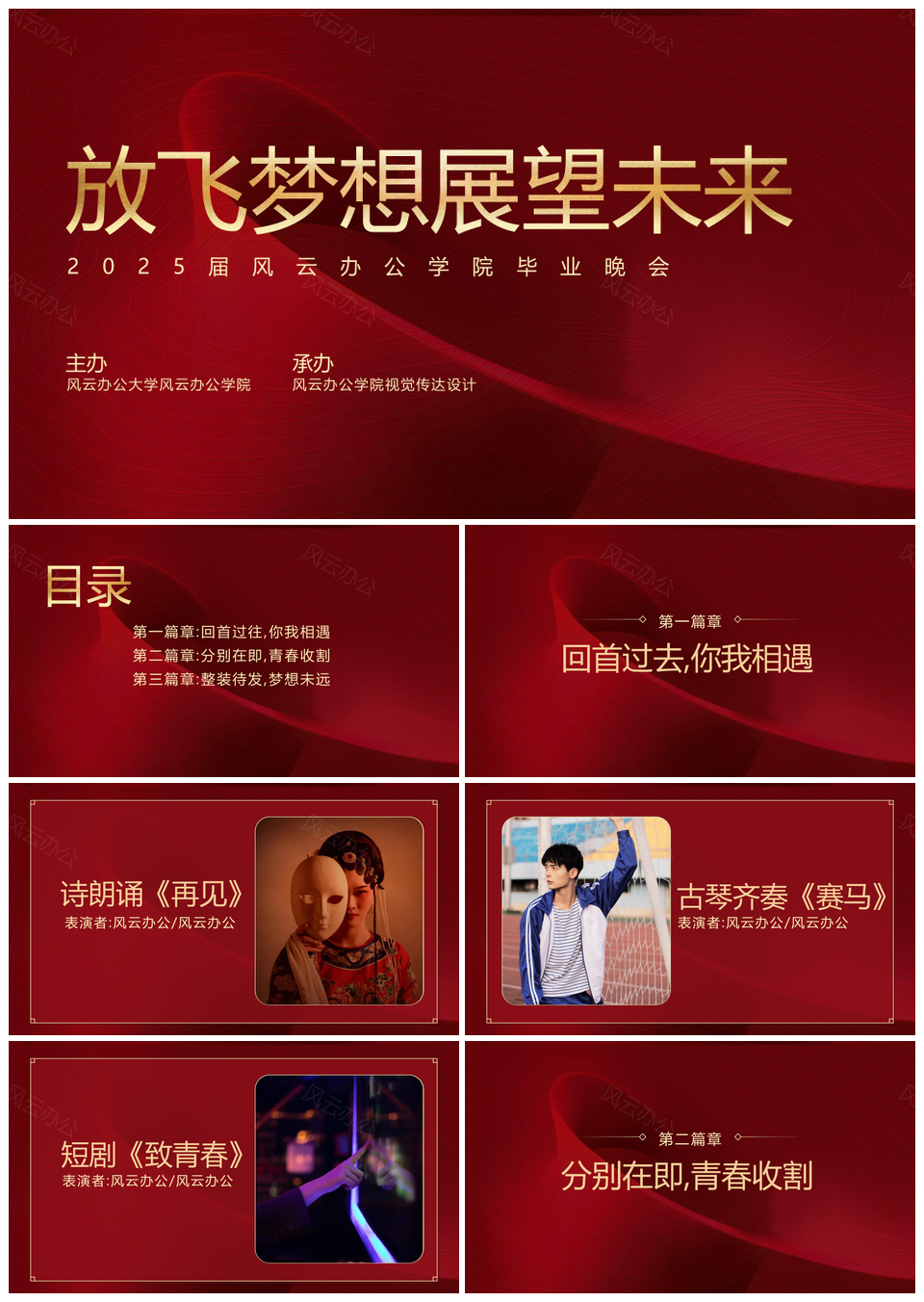 风云办公提供的2025红庆简约商务年会毕业盛典PPT模板,下载格式为pptx,一共18页,作品中文字及图均可以修改和编辑,图片更改请在作品中右键图片并更换,文字修改请直接点击文字进行修改。