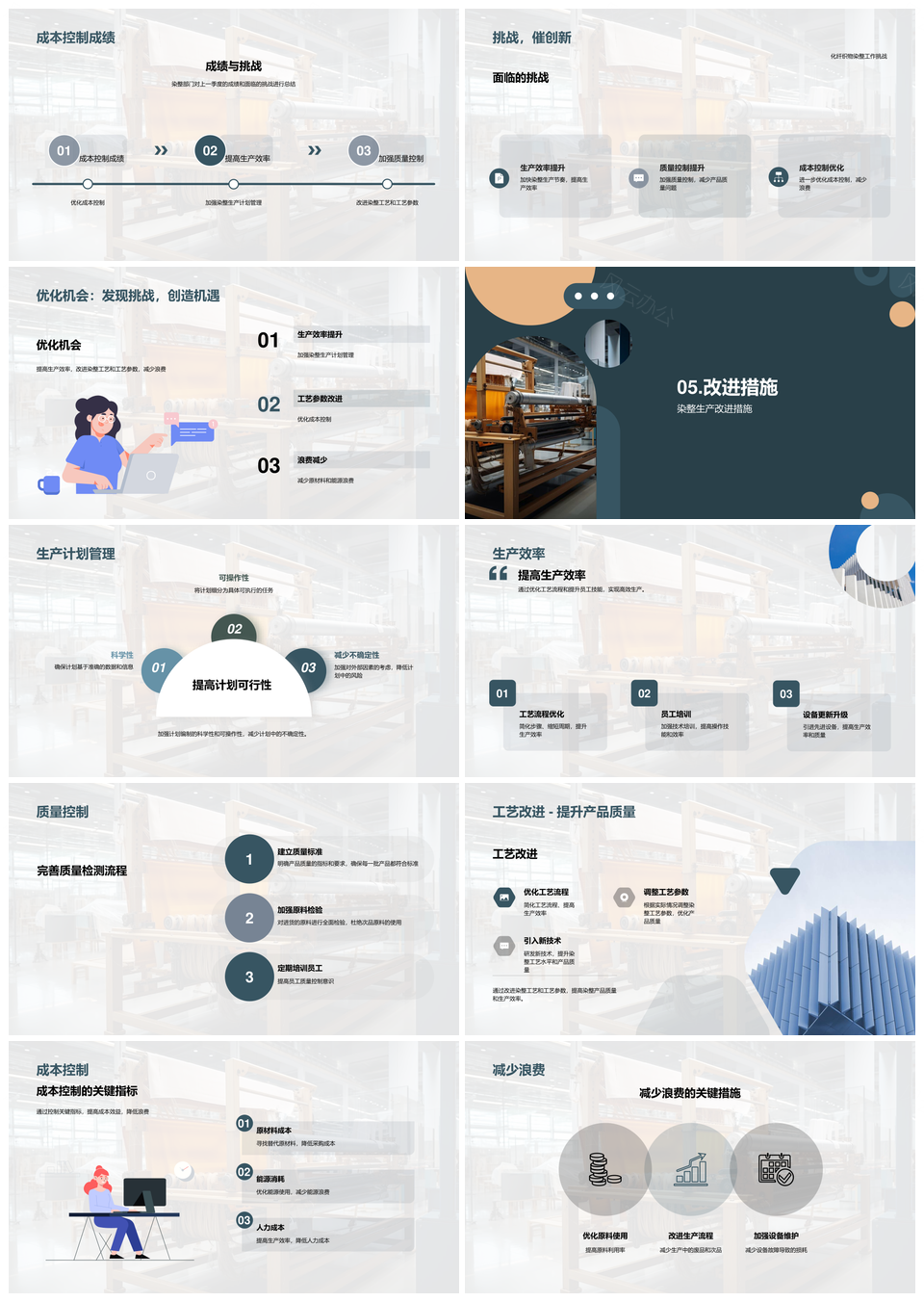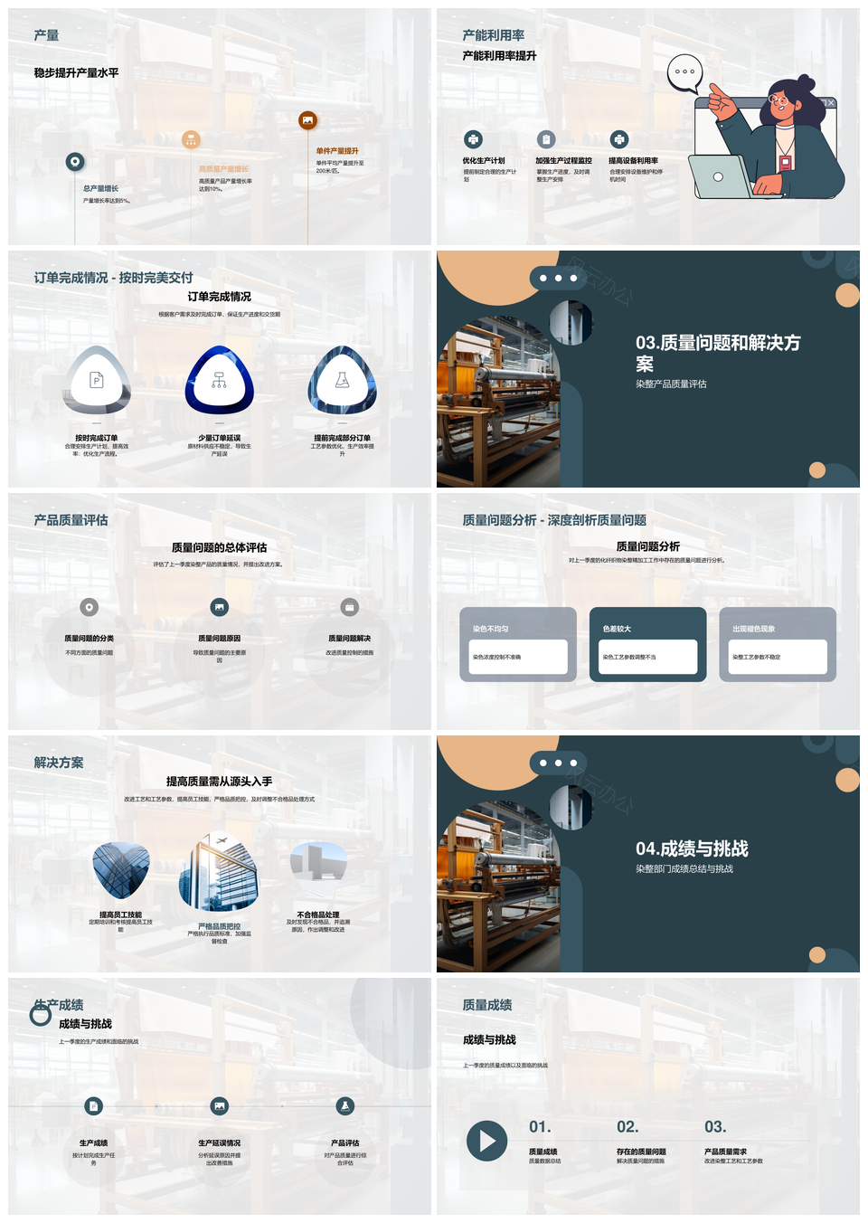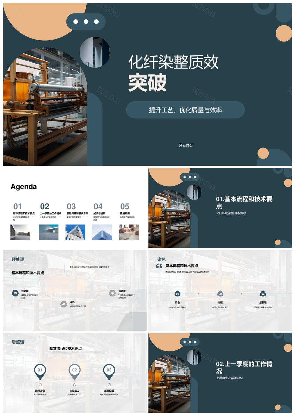 这是一张化纤染整部门季度总结生产质控成本技术机械PPT模板,包含化纤染整、部门、季度总结、生产、质控、成本、技术、机械等主题内容,也可用作化纤染整部门季度总结、化纤染整生产质控、部门季度生产成本、生产技术机械总结、染整部门技术机械、生产质控成本技术、季度总结生产技术、化纤染整成本技术、部门质控技术机械、季度生产质控成本、总结生产技术机械、化纤生产质控技术、部门季度技术机械、染整生产质控机械、季度生产技术成本等PPT场景使用。 风云办公提供的化纤染整部门季度总结生产质控成本技术机械PPT模板,下载格式为pptx,一共28页,作品中文字及图均可以修改和编辑,图片更改请在作品中右键图片并更换,文字修改请直接点击文字进行修改。