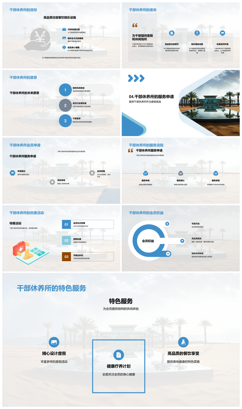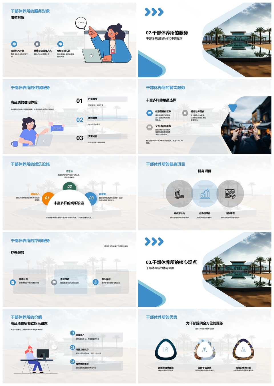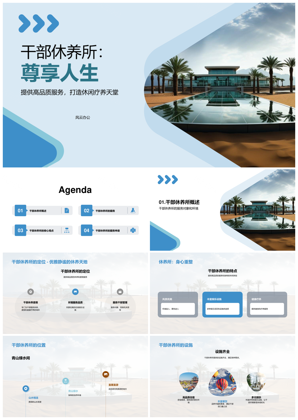 风云办公提供的干部休养所康养度假村高品质休养食宿PPT模板,下载格式为pptx,一共27页,作品中文字及图均可以修改和编辑,图片更改请在作品中右键图片并更换,文字修改请直接点击文字进行修改。