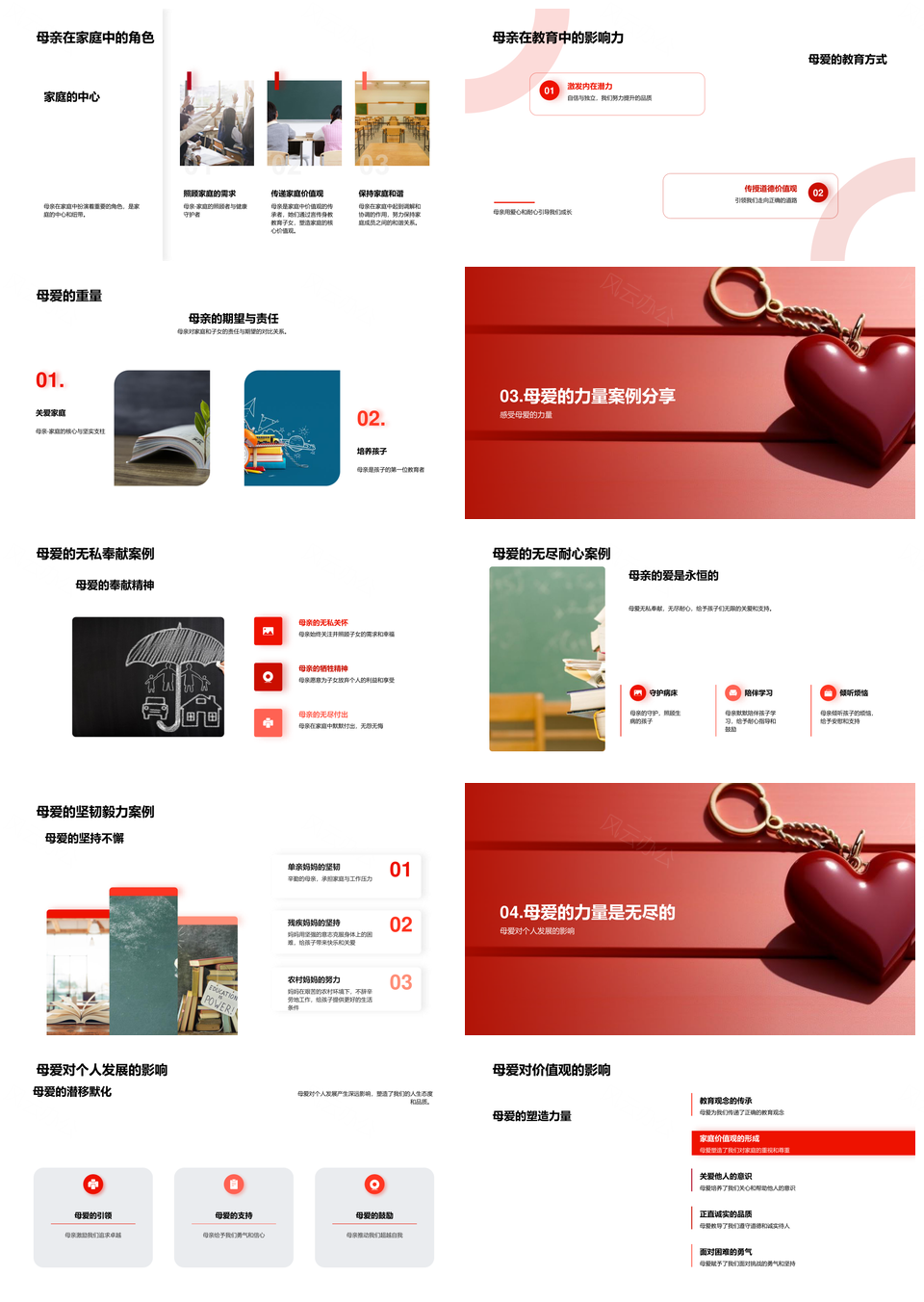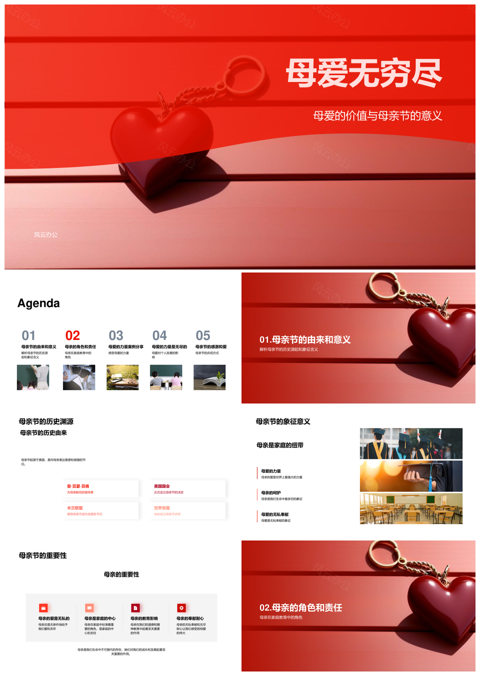 风云办公提供的母爱无尽母亲节心形坠颂奉献力量PPT模板,下载格式为pptx,一共23页,作品中文字及图均可以修改和编辑,图片更改请在作品中右键图片并更换,文字修改请直接点击文字进行修改。
