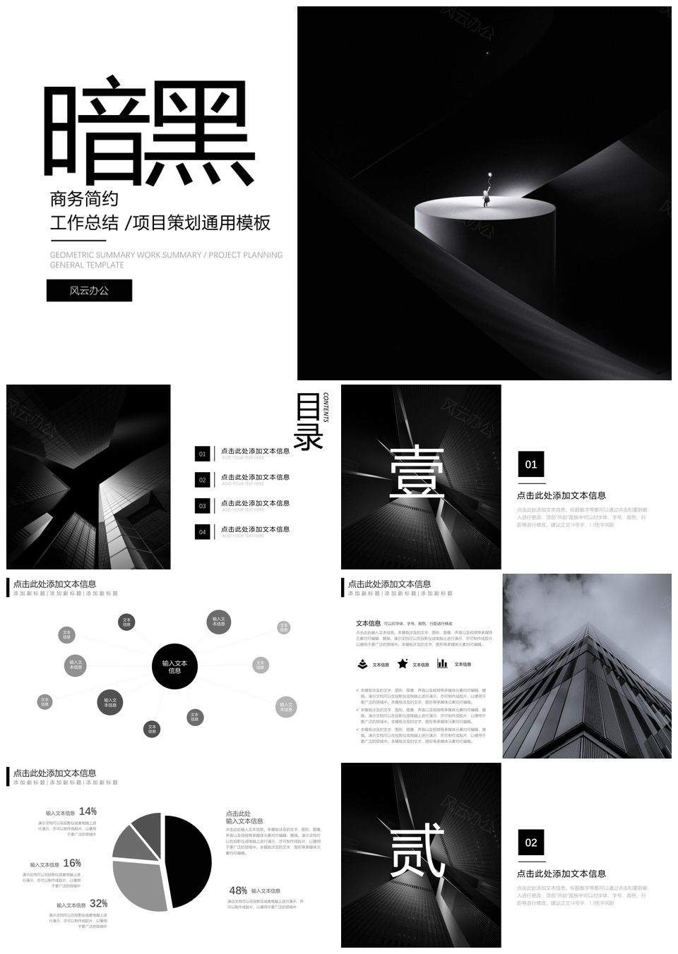 风云办公提供的白色简约暗黑稳重商务工作PPT模板,下载格式为pptx,一共19页,作品中文字及图均可以修改和编辑,图片更改请在作品中右键图片并更换,文字修改请直接点击文字进行修改。