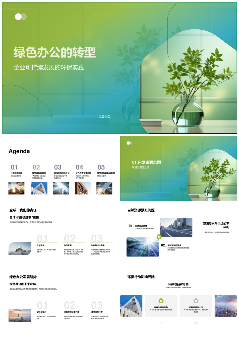 风云办公提供的绿色办公助力企业可持续发展实践PPT模板,下载格式为pptx,一共24页,作品中文字及图均可以修改和编辑,图片更改请在作品中右键图片并更换,文字修改请直接点击文字进行修改。