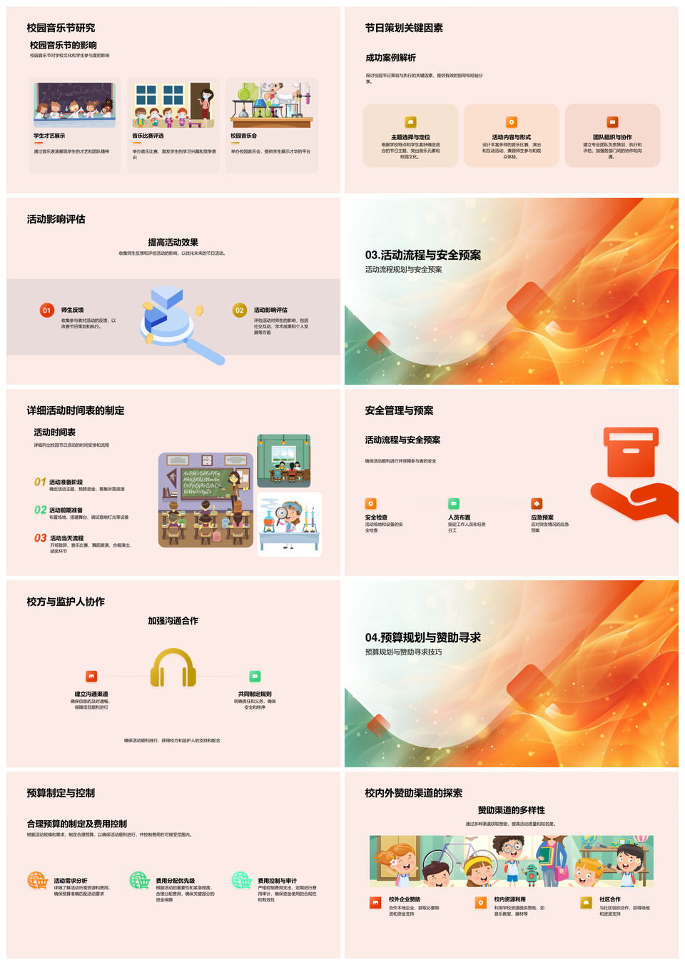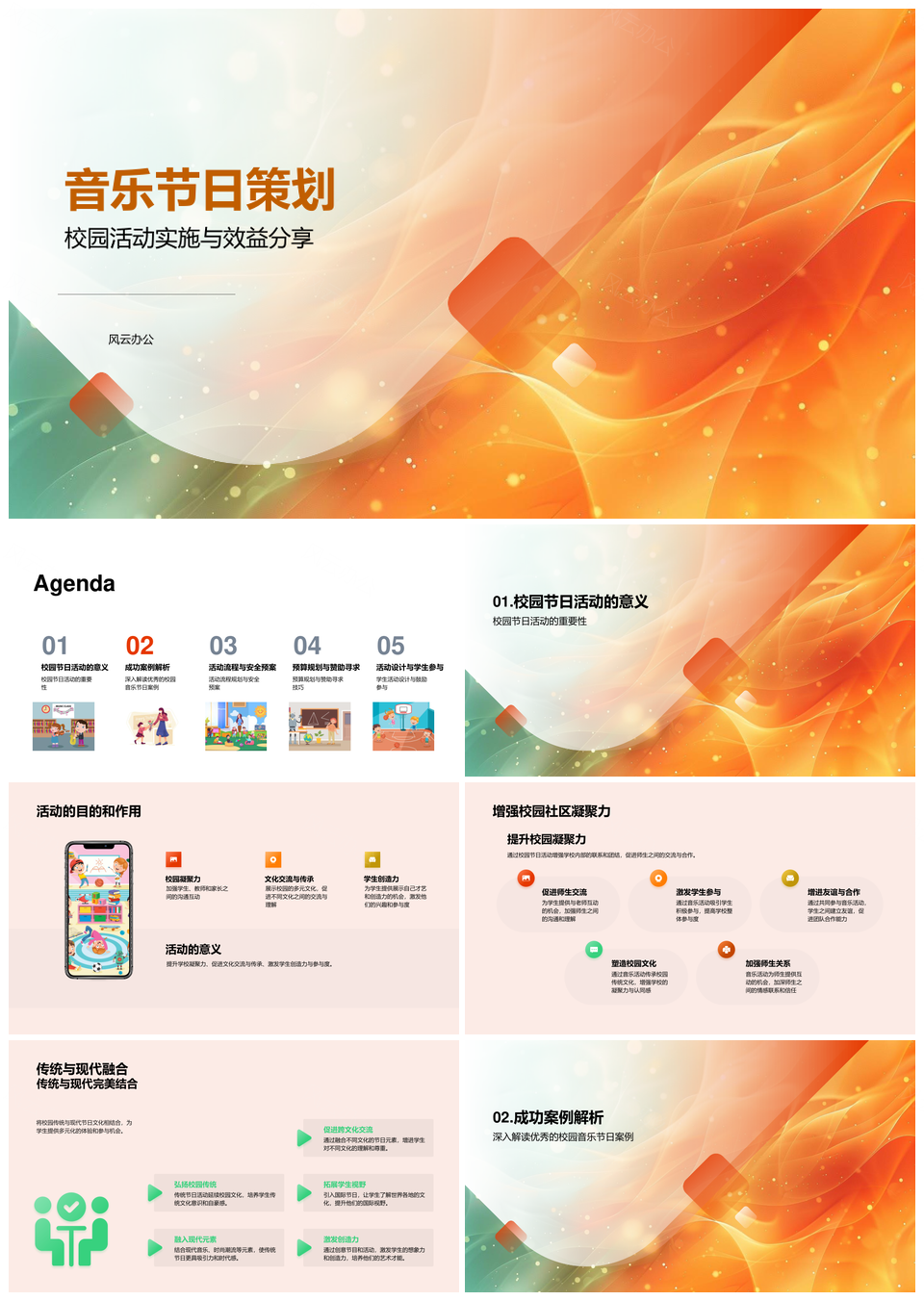 这是一张校园音乐节策划实施效益社群赞助评估宣传整合PPT模板,包含校园、音乐节、策划、实施、效益、社群、赞助、评估、宣传、整合等主题内容,也可用作校园音乐节策划实施、音乐节策划实施效益、策划实施效益社群、实施效益社群赞助、效益社群赞助评估、社群赞助评估宣传、赞助评估宣传整合、校园音乐节策划、音乐节策划实施、策划实施效益、社群赞助评估、赞助评估宣传、评估宣传整合、校园音乐节、音乐节策划等PPT场景使用。 风云办公提供的校园音乐节策划实施效益社群赞助评估宣传整合PPT模板,下载格式为pptx,一共23页,作品中文字及图均可以修改和编辑,图片更改请在作品中右键图片并更换,文字修改请直接点击文字进行修改。