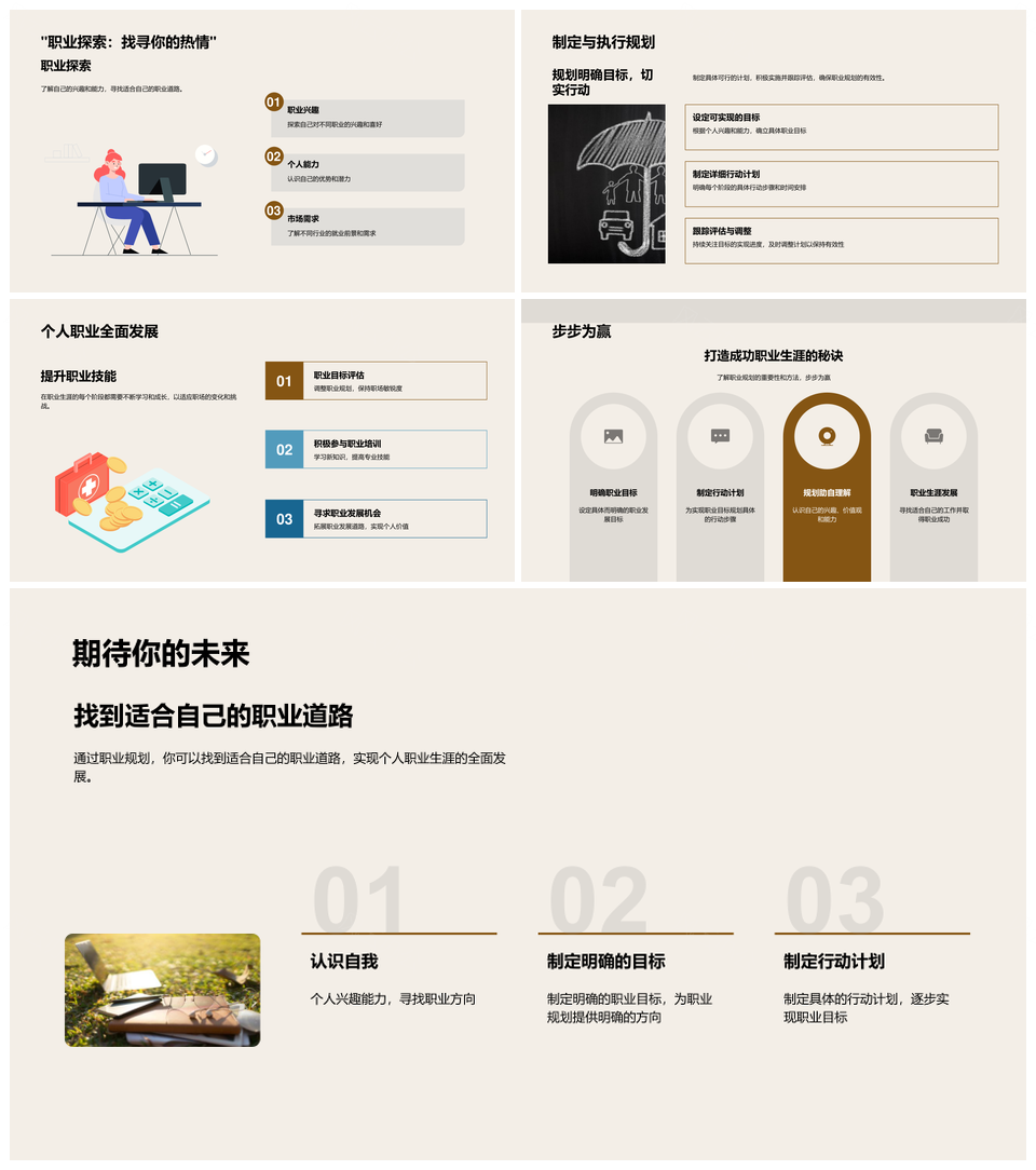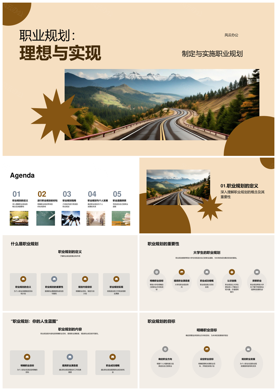 风云办公提供的大学生职业规划探索目标启程行动PPT模板,下载格式为pptx,一共33页,作品中文字及图均可以修改和编辑,图片更改请在作品中右键图片并更换,文字修改请直接点击文字进行修改。