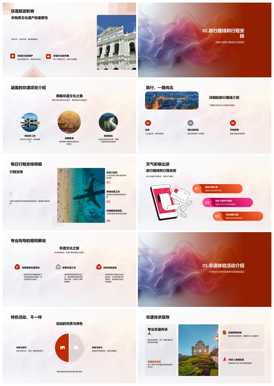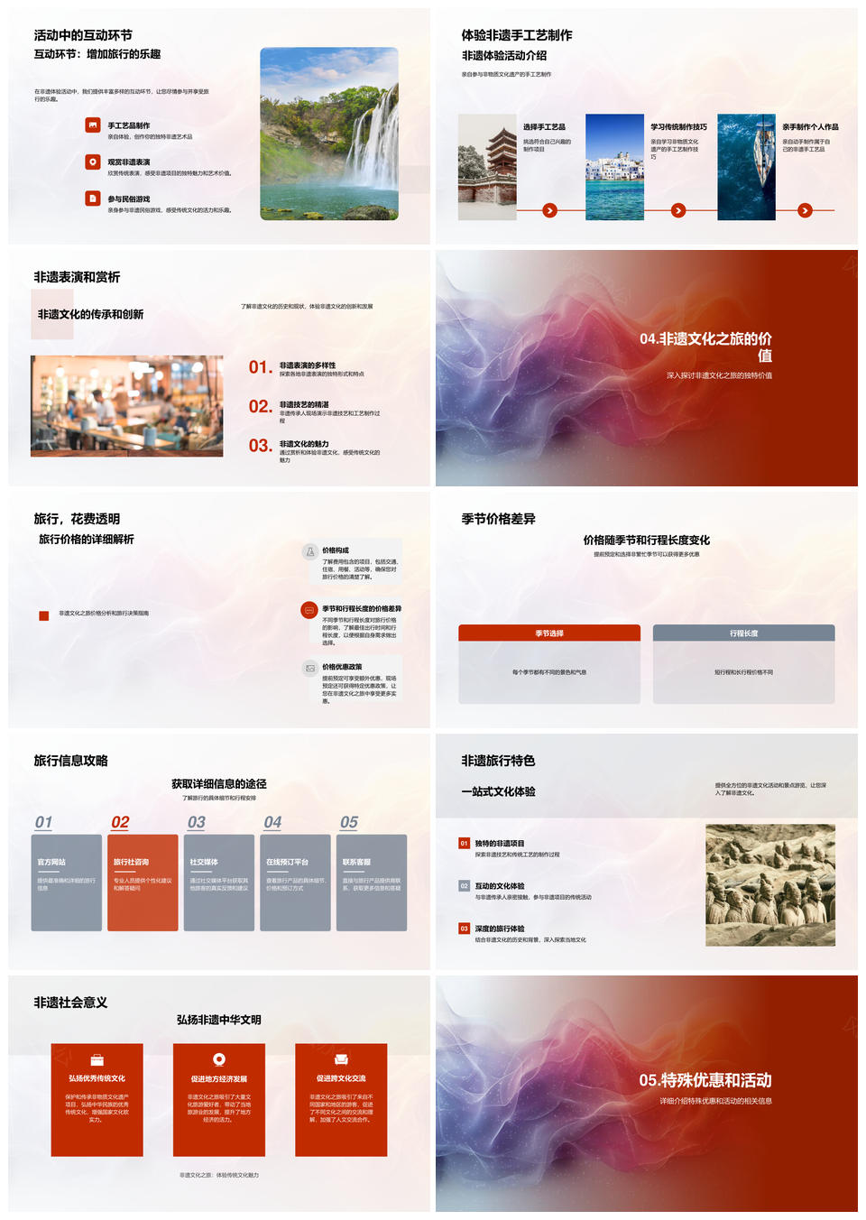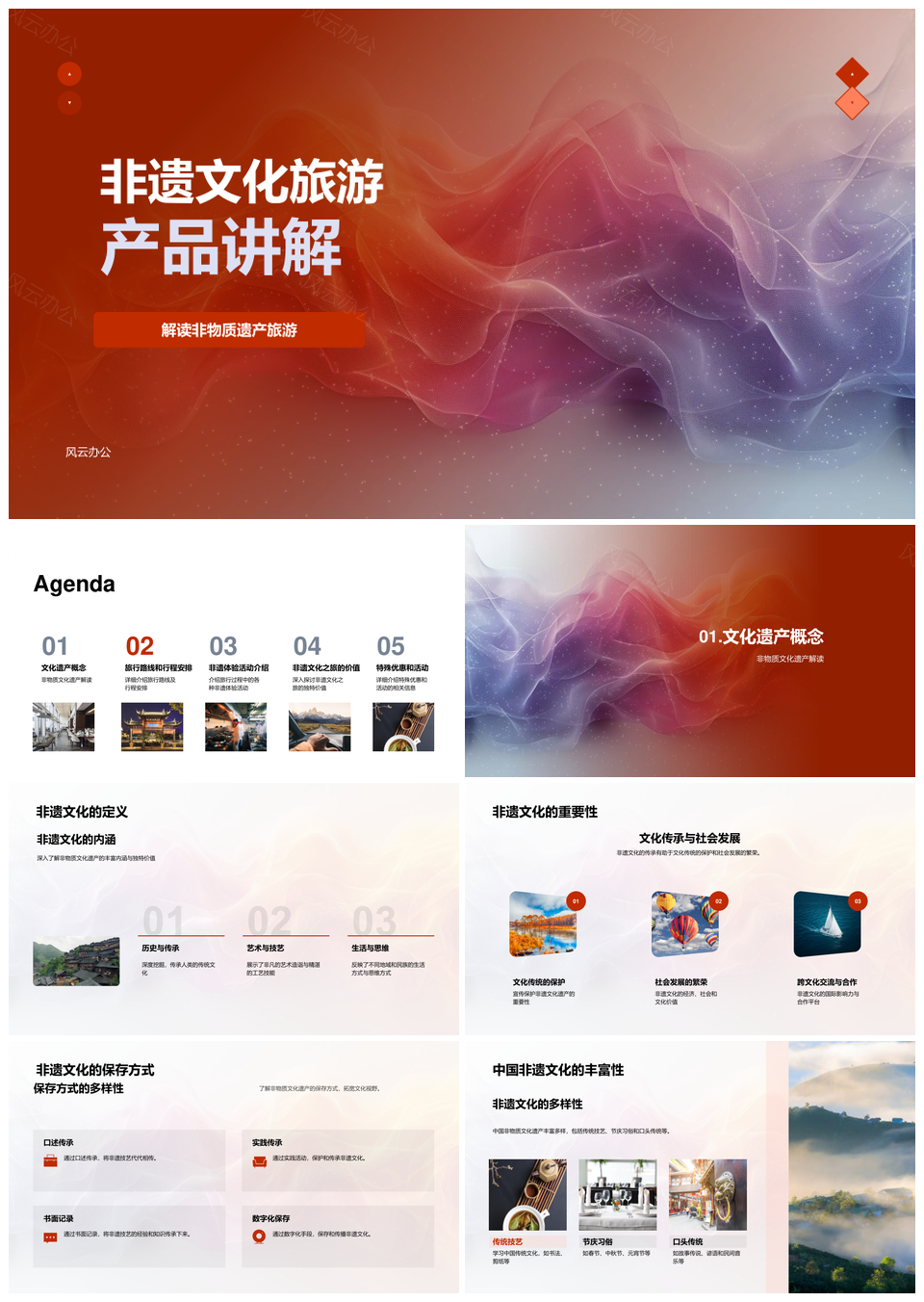 风云办公提供的非遗文化旅游营销路线项目特色介绍PPT模板,下载格式为pptx,一共33页,作品中文字及图均可以修改和编辑,图片更改请在作品中右键图片并更换,文字修改请直接点击文字进行修改。