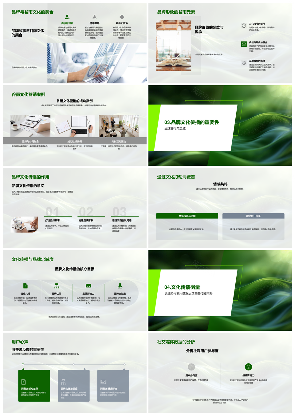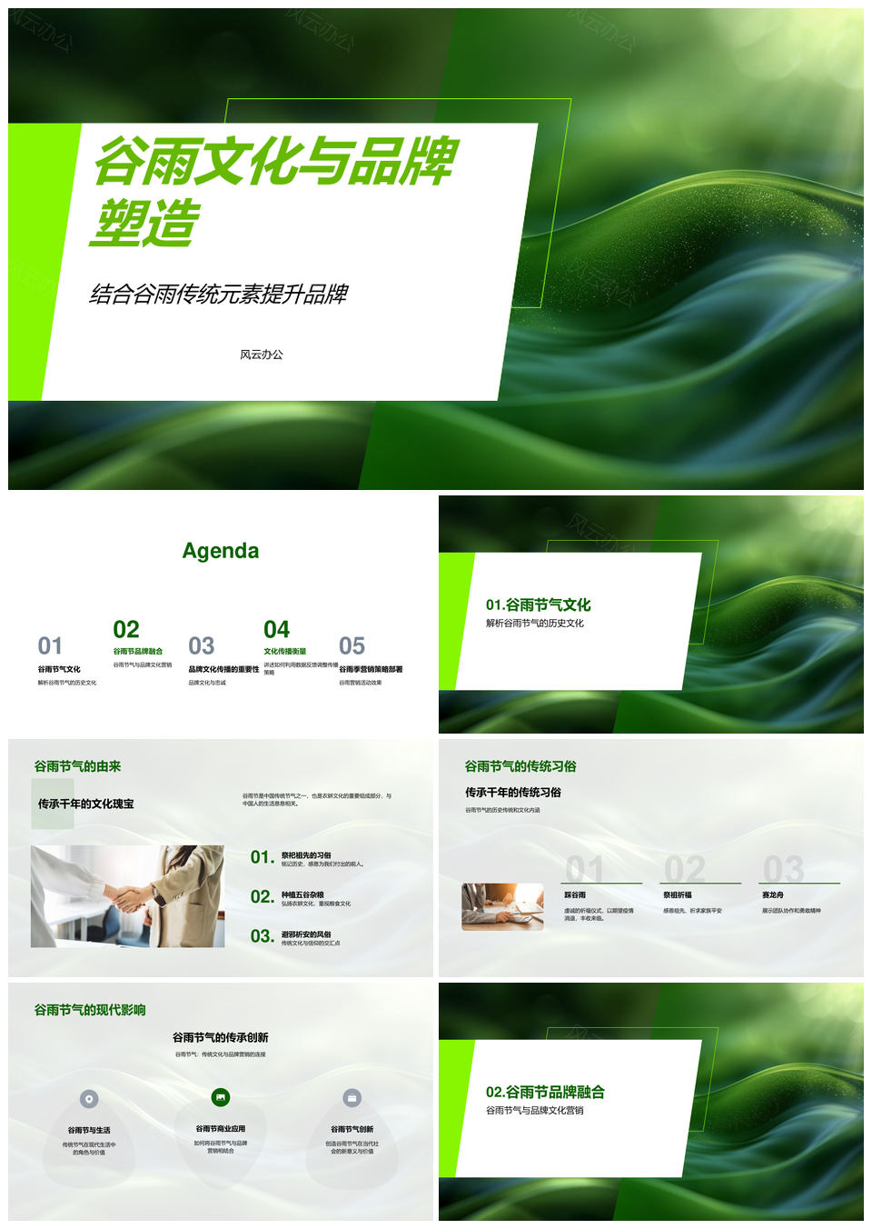 风云办公提供的谷雨文化品牌营销传播数据策略PPT模板,下载格式为pptx,一共23页,作品中文字及图均可以修改和编辑,图片更改请在作品中右键图片并更换,文字修改请直接点击文字进行修改。