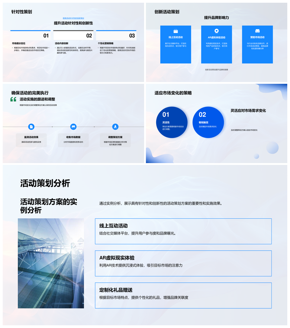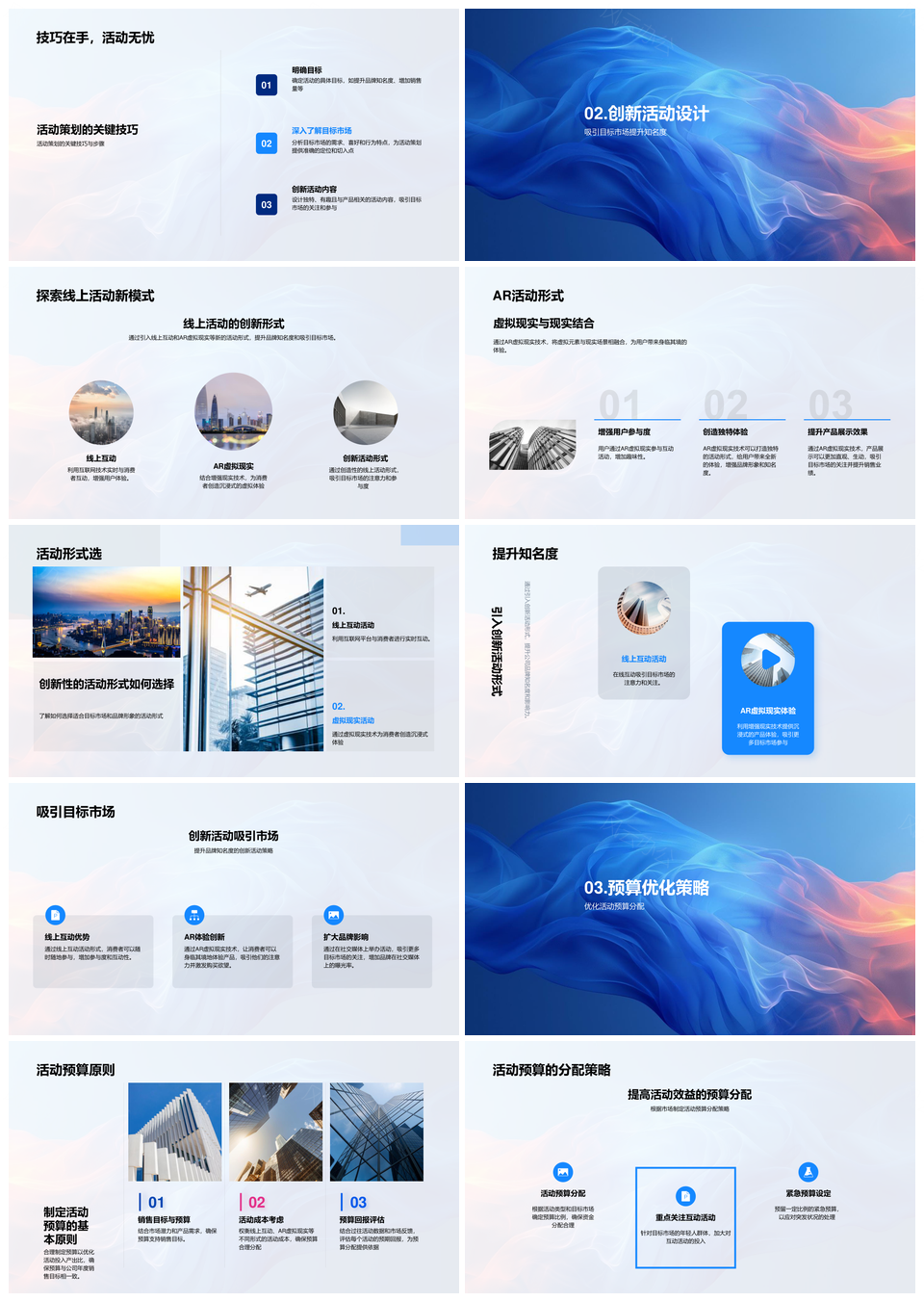 这是一张2025活动策划销售提升品牌营销目标市场AR互动预算优化PPT模板,包含2025、活动策划、销售提升、品牌、营销、目标市场、AR互动、预算优化等主题内容,也可用作2025活动策划销售提升品牌营销目标市场、活动策划销售提升品牌营销目标市场、销售提升品牌营销目标市场AR互动、品牌营销目标市场AR互动预算优化、目标市场AR互动预算优化、活动策划销售提升品牌营销、销售提升品牌营销目标市场、品牌营销目标市场AR互动、目标市场AR互动预算优化、活动策划销售提升、品牌营销目标市场、AR互动预算优化、销售提升品牌营销、目标市场AR互动、活动策划品牌营销等PPT场景使用。 风云办公提供的2025活动策划销售提升品牌营销目标市场AR互动预算优化PPT模板,下载格式为pptx,一共33页,作品中文字及图均可以修改和编辑,图片更改请在作品中右键图片并更换,文字修改请直接点击文字进行修改。
