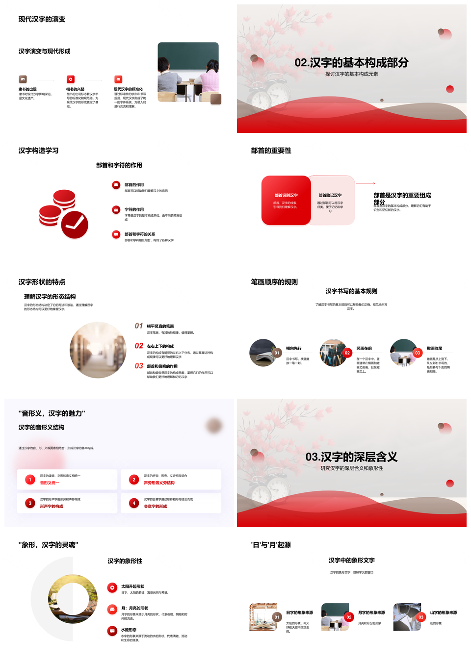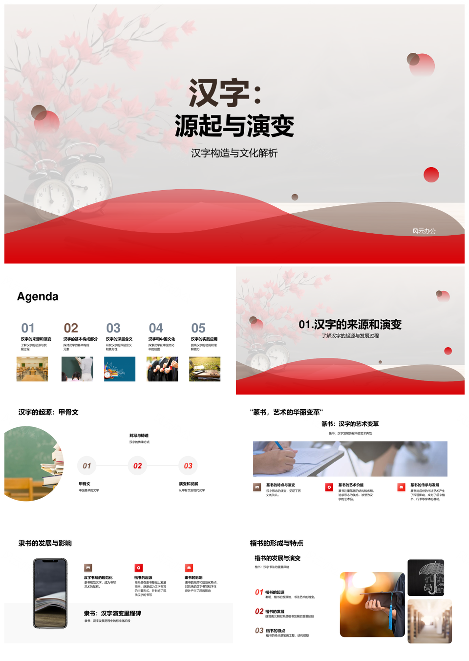 这是一张汉字源起构造演变与甲骨文篆书隶书解析PPT模板,包含汉字源起、构造演变、甲骨文、篆书、隶书、解析等主题内容,也可用作汉字源起构造演变、源起构造演变解析、汉字源起甲骨文解析、甲骨文篆书隶书解析、汉字构造演变解析、源起演变篆书隶书、构造演变篆书解析、甲骨文篆书演变解析、汉字源起篆书隶书、构造甲骨文隶书解析、汉字演变篆书解析、源起甲骨文篆书隶书、汉字篆书隶书解析、构造演变甲骨文、源起篆书解析、甲骨文隶书解析等PPT场景使用。 风云办公提供的汉字源起构造演变与甲骨文篆书隶书解析PPT模板,下载格式为pptx,一共33页,作品中文字及图均可以修改和编辑,图片更改请在作品中右键图片并更换,文字修改请直接点击文字进行修改。