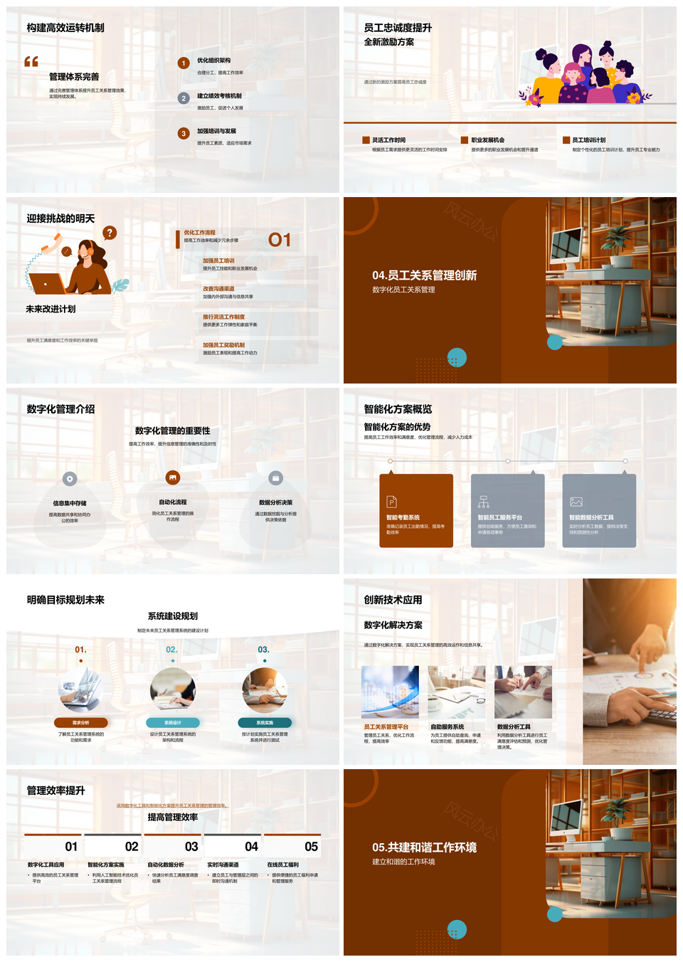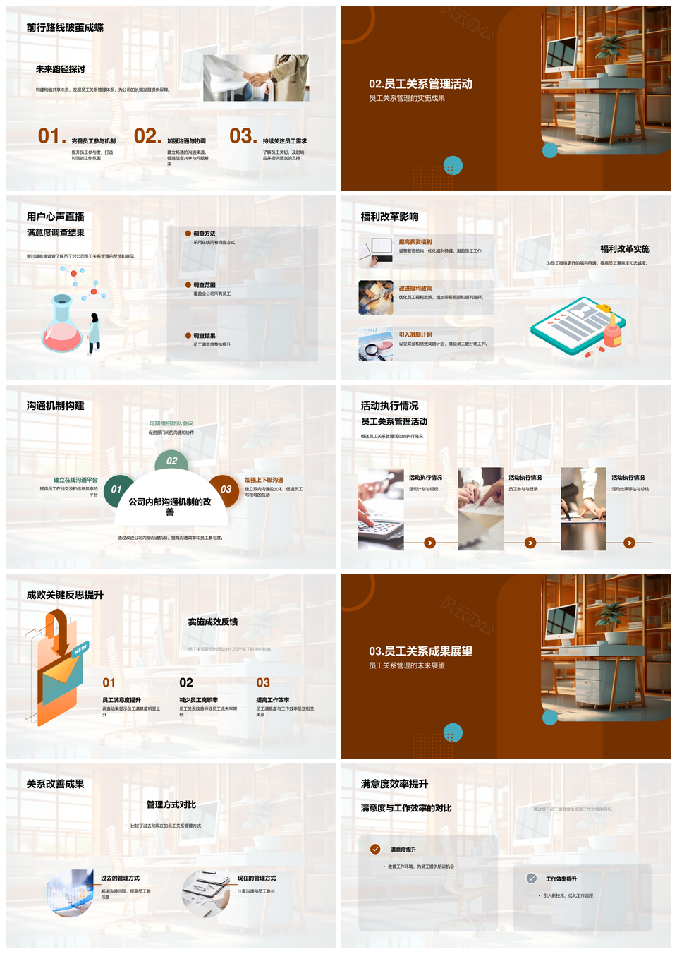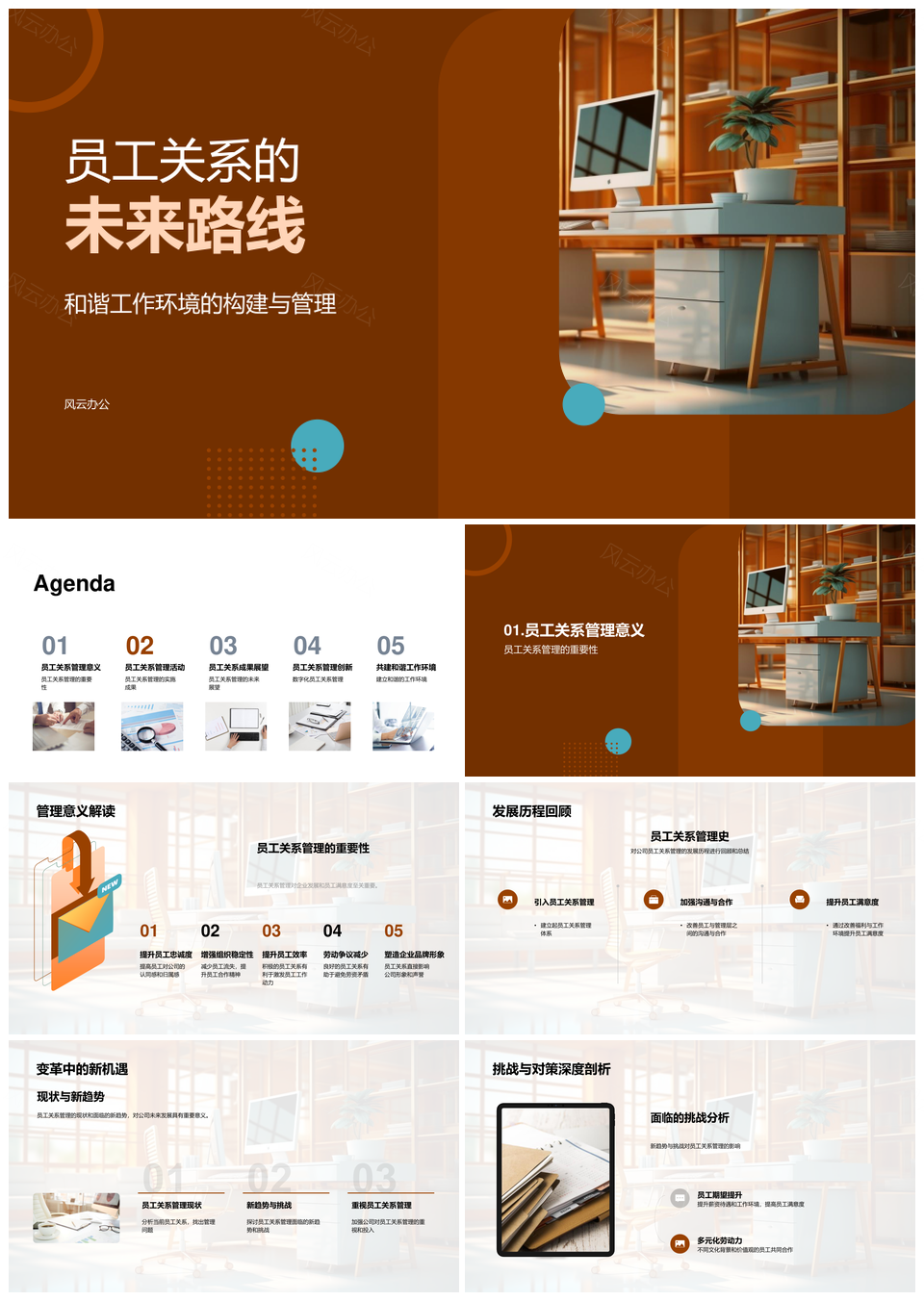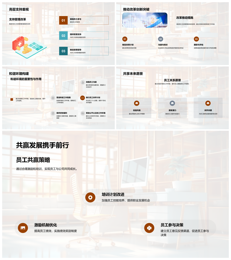 这是一张员工关系管理和谐环境满意度福利效率提升PPT模板,包含员工关系、管理、和谐环境、满意度、福利、效率提升等主题内容,也可用作员工关系管理和谐、关系管理和谐环境、管理和谐环境满意度、和谐环境满意度福利、环境满意度福利效率、满意度福利效率提升、员工关系管理、关系管理和谐、管理和谐环境、和谐环境满意度、环境满意度福利、福利效率提升、员工关系、关系管理、管理和谐等PPT场景使用。 风云办公提供的员工关系管理和谐环境满意度福利效率提升PPT模板,下载格式为pptx,一共33页,作品中文字及图均可以修改和编辑,图片更改请在作品中右键图片并更换,文字修改请直接点击文字进行修改。