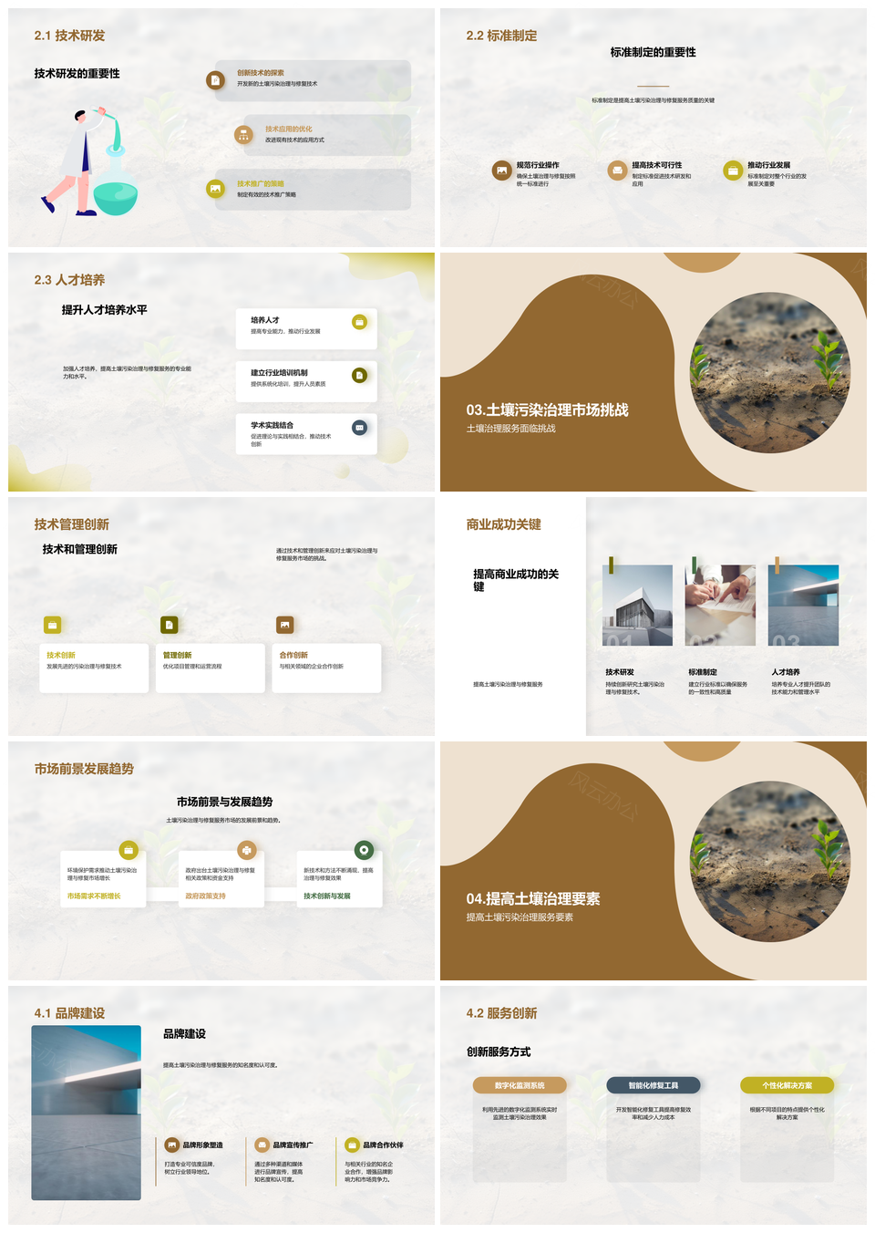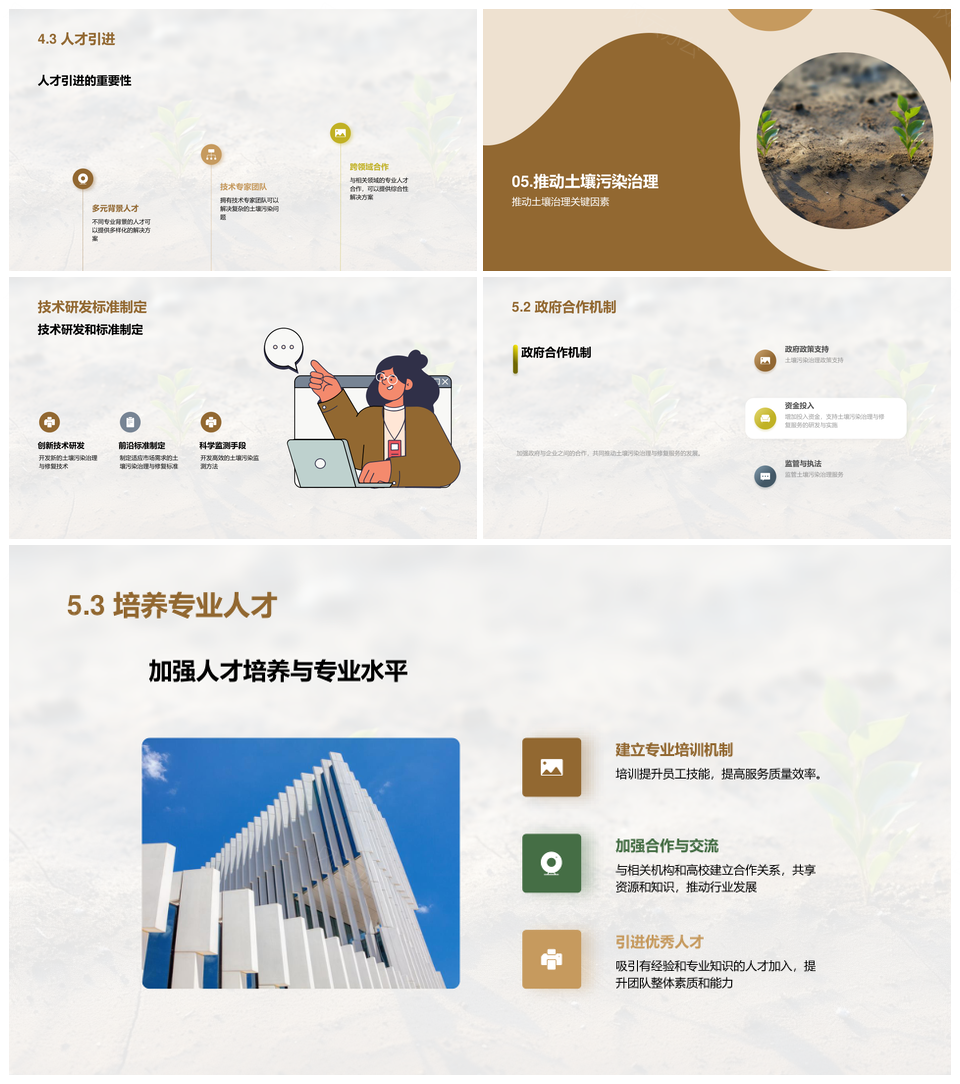 这是一张土壤污染治理技术研发与修复服务提质增效PPT模板,包含土壤污染治理技术、研发、修复服务、提质增效等主题内容,也可用作土壤污染治理技术研发修复服务、治理技术研发修复服务提质、技术研发修复服务提质增效、土壤污染治理技术研发、治理技术研发修复、技术研发修复服务、研发修复服务提质、修复服务提质增效、土壤污染治理、治理技术、技术研发、研发修复、修复服务、服务提质、提质增效等PPT场景使用。 风云办公提供的土壤污染治理技术研发与修复服务提质增效PPT模板,下载格式为pptx,一共23页,作品中文字及图均可以修改和编辑,图片更改请在作品中右键图片并更换,文字修改请直接点击文字进行修改。
