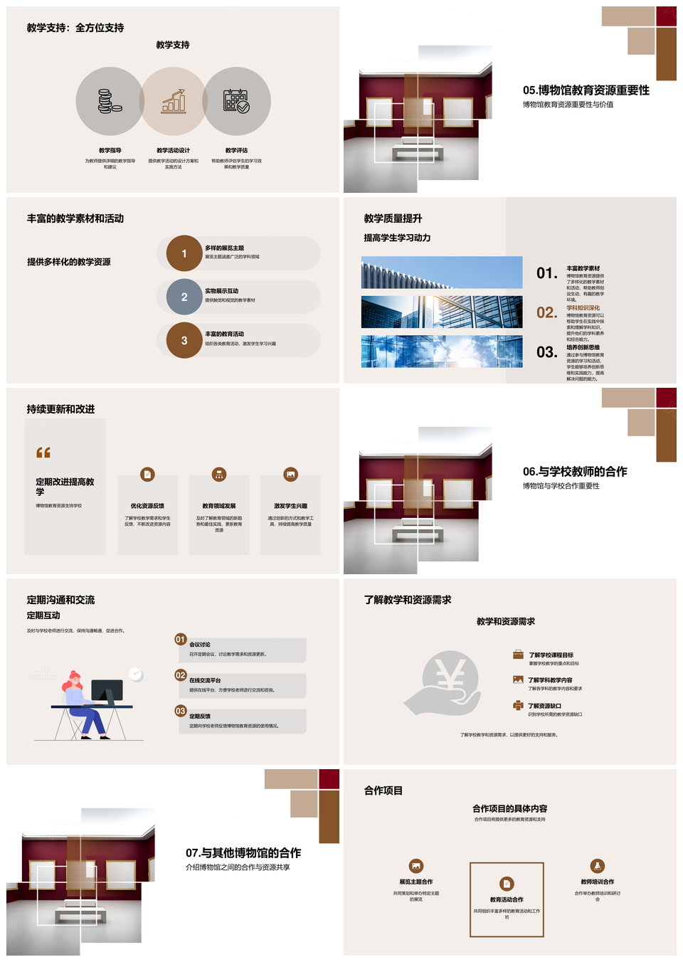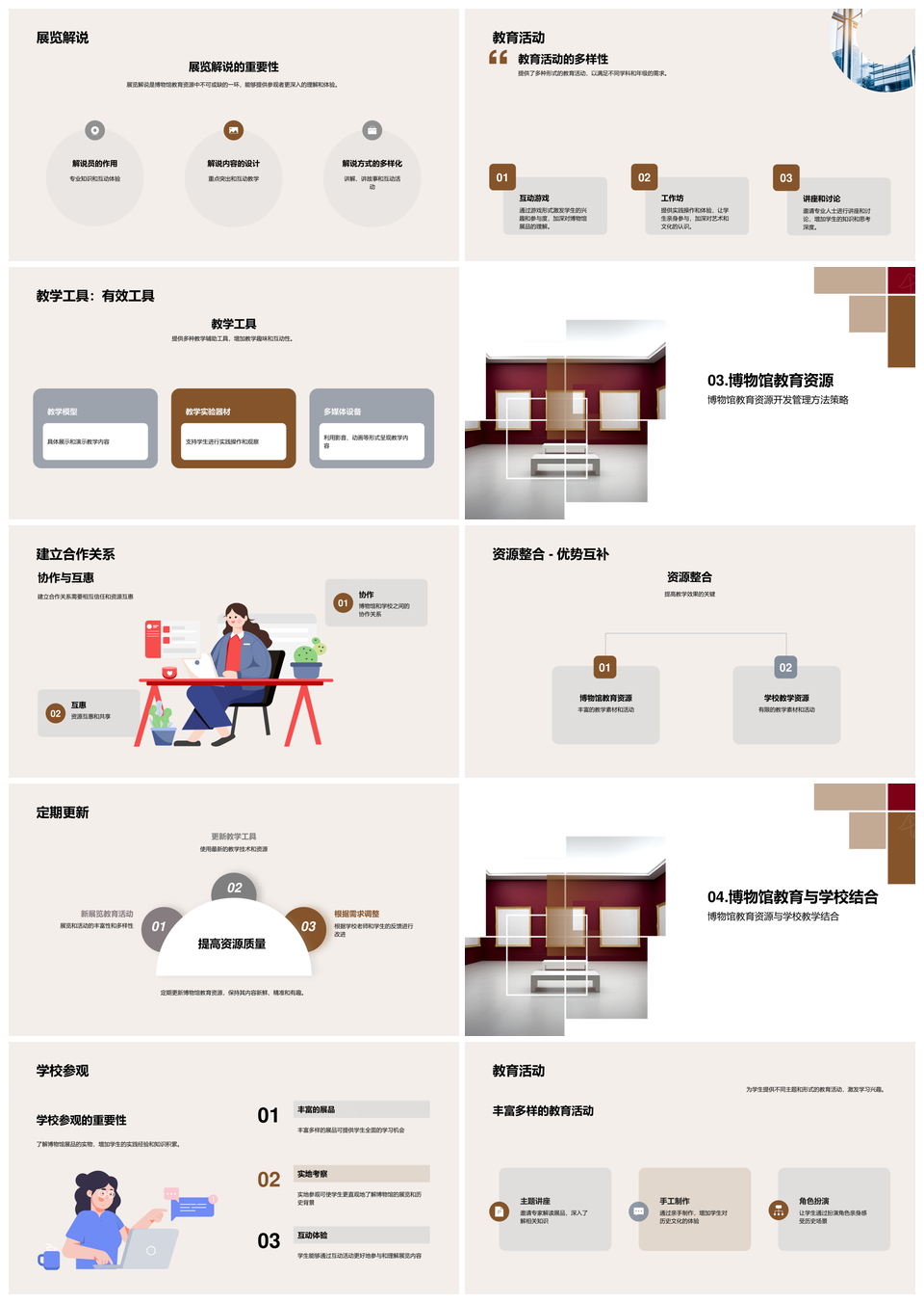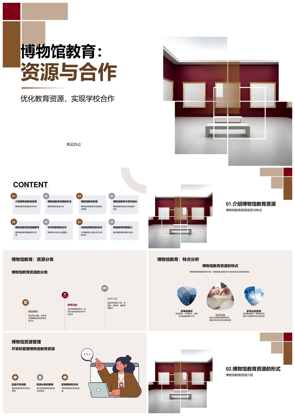 这是一张博物馆教育资源开发管理教育主管关联展览展品解说PPT模板,包含博物馆、教育资源、开发、管理、教育主管、关联、展览、展品、解说等主题内容,也可用作博物馆教育资源开发、教育主管关联展览展品、博物馆教育主管关联展览、教育资源开发管理教育、开发管理教育主管关联、关联展览展品解说资源、管理教育主管关联展览、教育资源开发管理主管、博物馆教育资源管理教育、展品解说教育主管关联、开发管理关联展览展品、资源开发管理教育主管、教育主管关联展览解说、管理教育关联展览展品、教育资源关联展览展品等PPT场景使用。 风云办公提供的博物馆教育资源开发管理教育主管关联展览展品解说PPT模板,下载格式为pptx,一共32页,作品中文字及图均可以修改和编辑,图片更改请在作品中右键图片并更换,文字修改请直接点击文字进行修改。