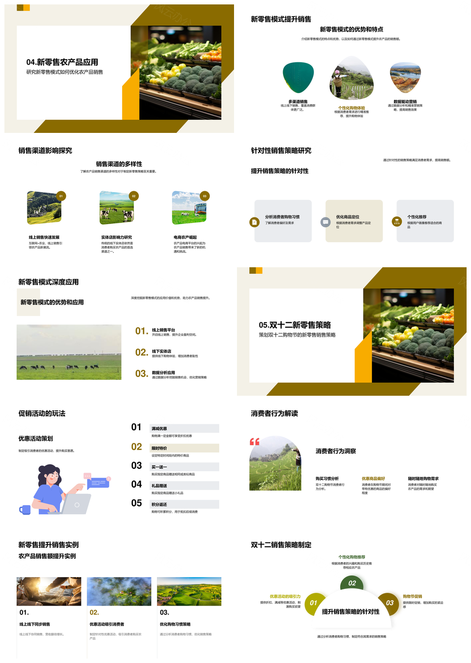 这是一张农业新零售双十二线上线下销售策略与优惠活动PPT模板,包含农业、新零售、双十二、线上、线下、销售策略、优惠活动等主题内容,也可用作农业新零售双十二线上线下、新零售双十二线上线下销售策略、双十二线上线下销售策略优惠活动、农业新零售双十二销售策略、农业新零售双十二优惠活动、农业新零售线上线下销售策略、农业新零售线上线下优惠活动、新零售双十二线上线下优惠活动、双十二线上线下销售策略优惠活动、农业新零售线上线下、新零售双十二线上线下、线上线下销售策略优惠活动、农业新零售双十二、双十二线上线下、线上线下销售策略等PPT场景使用。 风云办公提供的农业新零售双十二线上线下销售策略与优惠活动PPT模板,下载格式为pptx,一共28页,作品中文字及图均可以修改和编辑,图片更改请在作品中右键图片并更换,文字修改请直接点击文字进行修改。