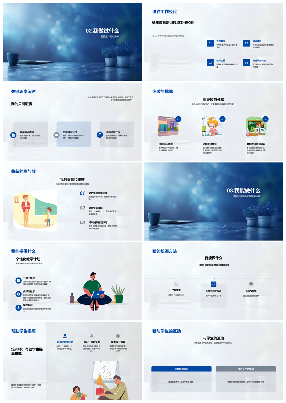 这是一张培训师求职演讲职业历程经验职责项目教学服务承诺PPT模板,包含培训师、求职、演讲、职业历程、经验、职责、项目、教学、服务、承诺等主题内容,也可用作培训师求职演讲职业历程、培训师职业历程教学服务、求职演讲职业历程经验、职业历程经验职责项目、经验职责项目教学服务、项目教学服务承诺、培训师求职演讲经验、求职演讲经验职责、职业历程经验教学、经验职责项目教学、职责项目教学服务、培训师教学服务承诺、求职职业历程职责、演讲职业历程项目、职责教学服务承诺等PPT场景使用。 风云办公提供的培训师求职演讲职业历程经验职责项目教学服务承诺PPT模板,下载格式为pptx,一共28页,作品中文字及图均可以修改和编辑,图片更改请在作品中右键图片并更换,文字修改请直接点击文字进行修改。