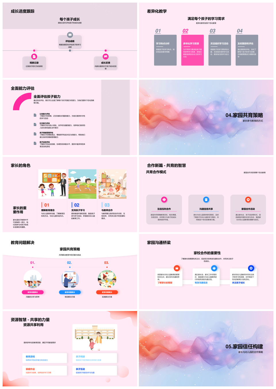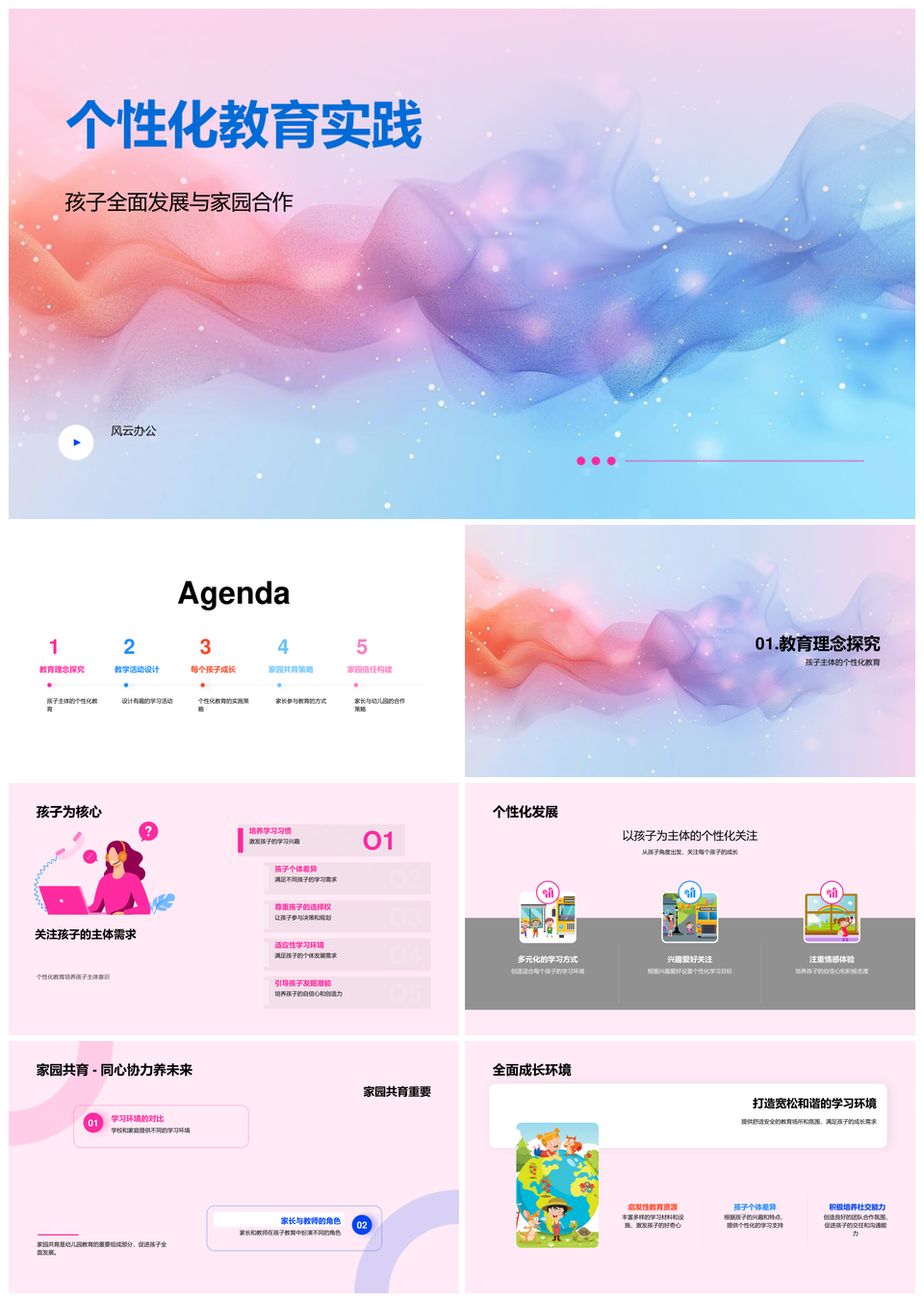 风云办公提供的家园合作幼儿园个性化教育全面发展PPT模板,下载格式为pptx,一共33页,作品中文字及图均可以修改和编辑,图片更改请在作品中右键图片并更换,文字修改请直接点击文字进行修改。