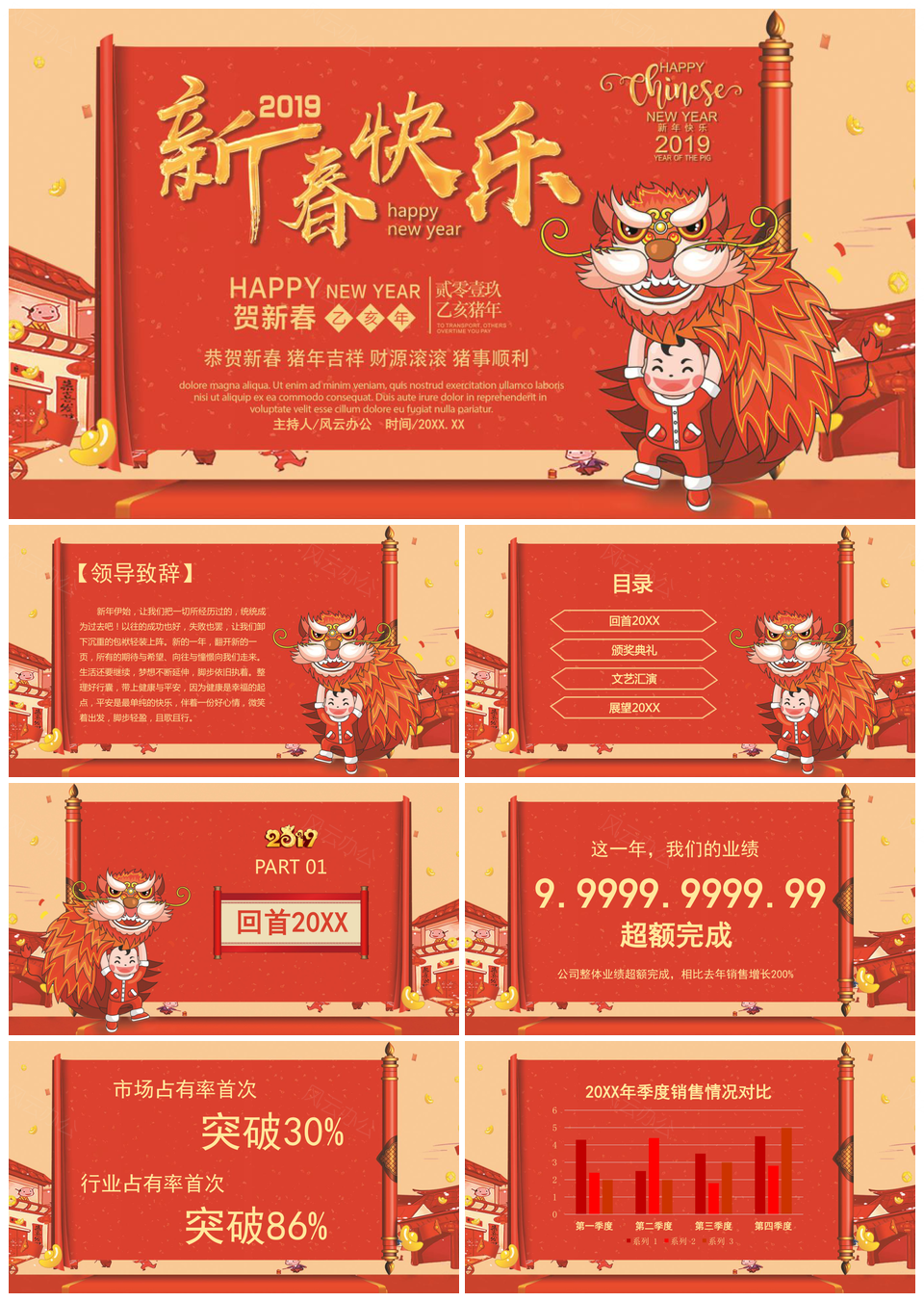 这是一张中国风猪年新春春节联欢晚会PPT模板,包含中国风、猪年、新春、春节、联欢晚会等主题内容,也可用作中国风、猪年、新春、春节、联欢晚会
