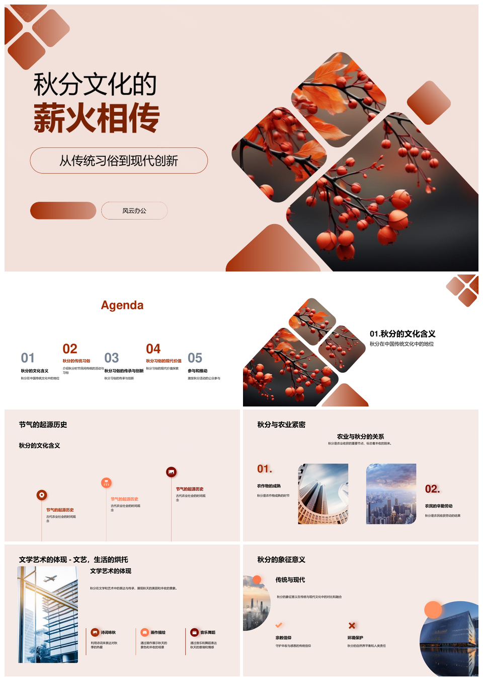 风云办公提供的秋分文化承古融新农艺文旅聚秋叶PPT模板,下载格式为pptx,一共33页,作品中文字及图均可以修改和编辑,图片更改请在作品中右键图片并更换,文字修改请直接点击文字进行修改。
