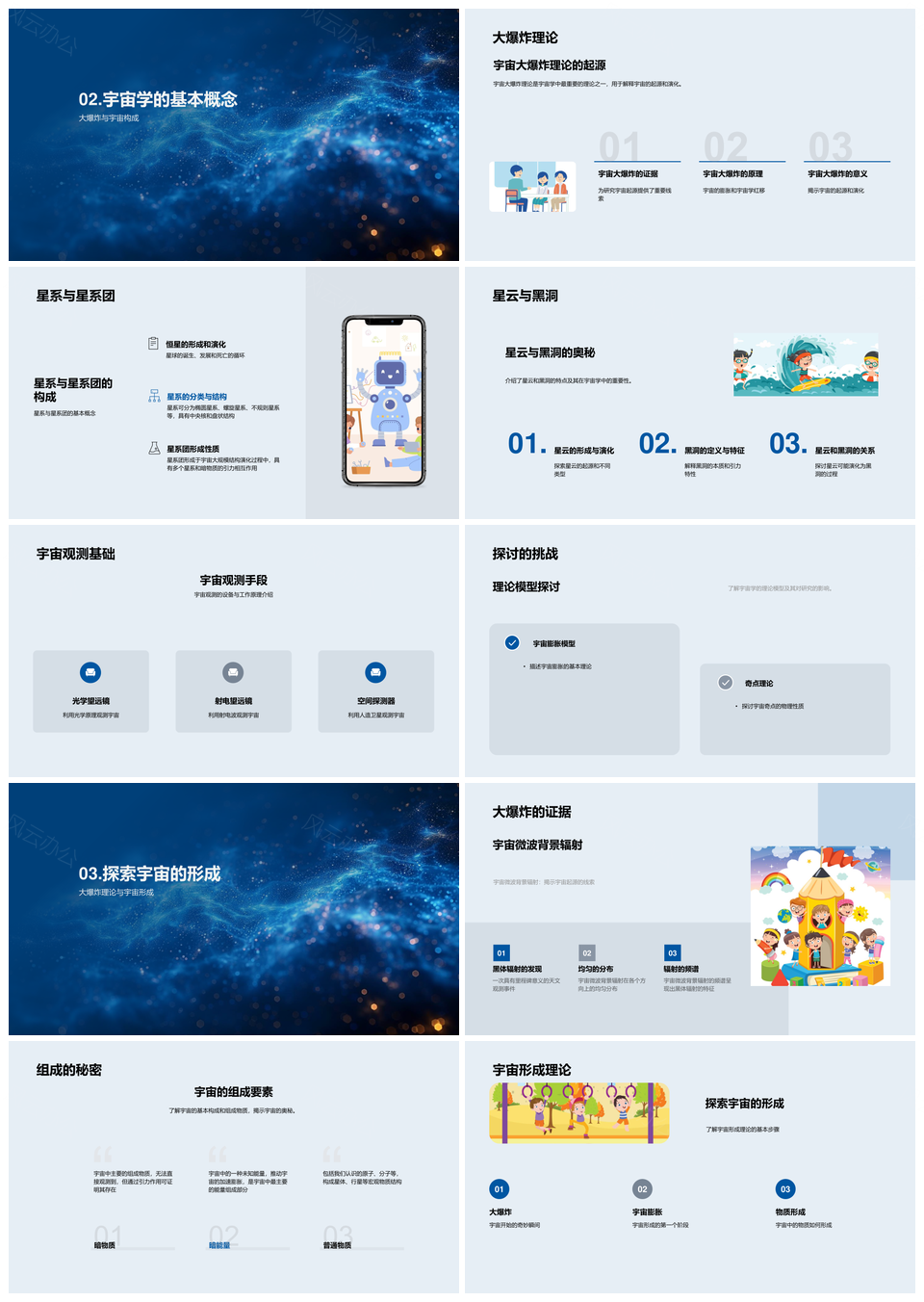 风云办公提供的宇宙大爆炸理论星系形成与黑洞观测PPT模板,下载格式为pptx,一共26页,作品中文字及图均可以修改和编辑,图片更改请在作品中右键图片并更换,文字修改请直接点击文字进行修改。