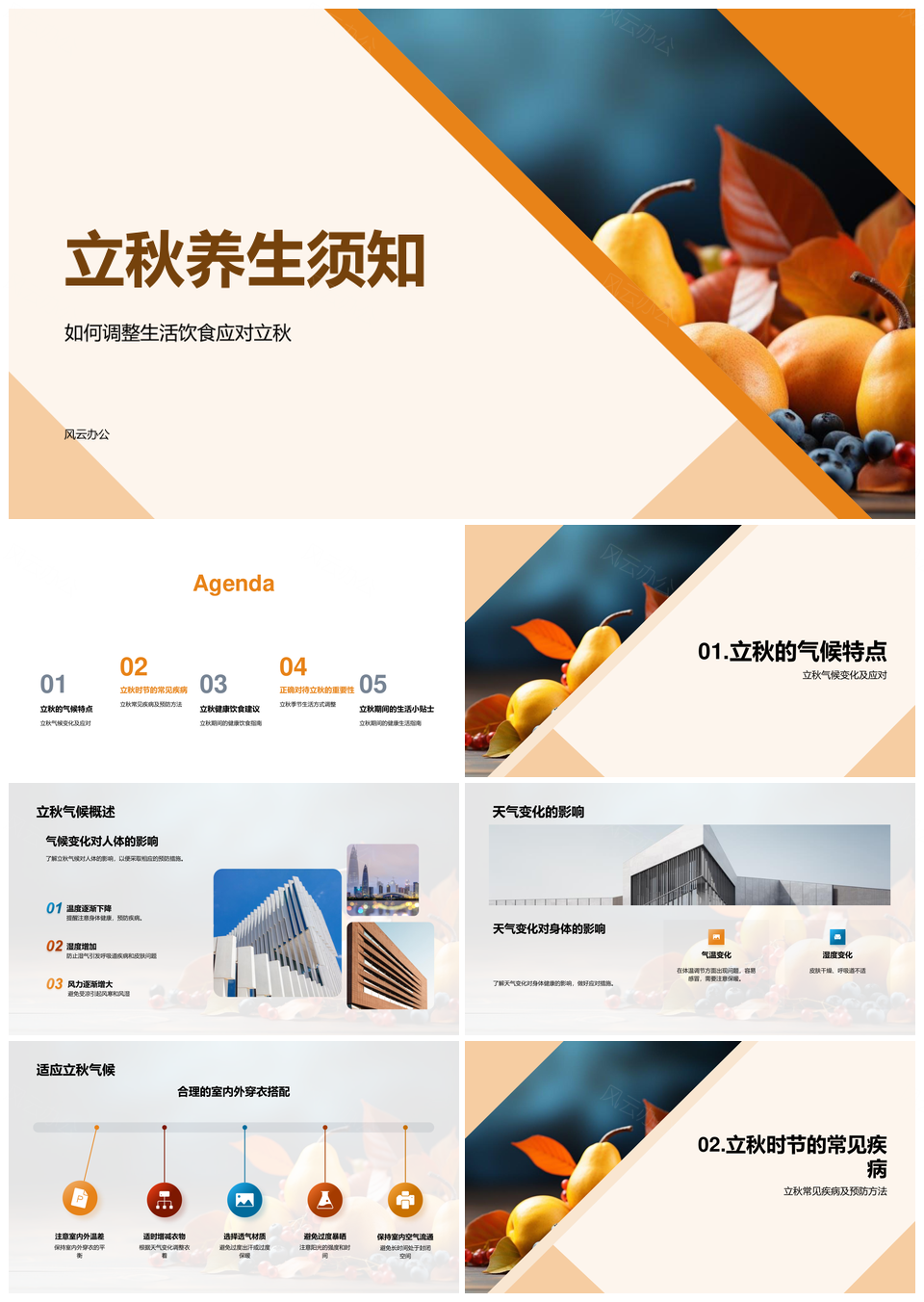 风云办公提供的立秋养生饮食调整防病应对气候变化PPT模板,下载格式为pptx,一共23页,作品中文字及图均可以修改和编辑,图片更改请在作品中右键图片并更换,文字修改请直接点击文字进行修改。