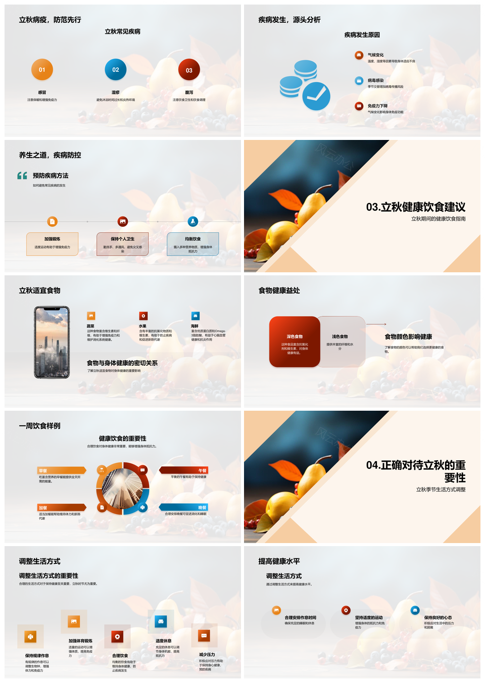 这是一张立秋养生饮食调整防病应对气候变化PPT模板,包含立秋、养生、饮食、调整、防病、应对、气候变化等主题内容,也可用作立秋养生饮食调整、养生饮食调整防病、饮食调整防病应对、调整防病应对气候变化、立秋养生饮食、养生饮食调整、饮食调整防病、防病应对气候变化、立秋应对气候变化、立秋饮食调整、立秋养生、养生饮食、饮食调整、调整防病、应对气候变化等PPT场景使用。