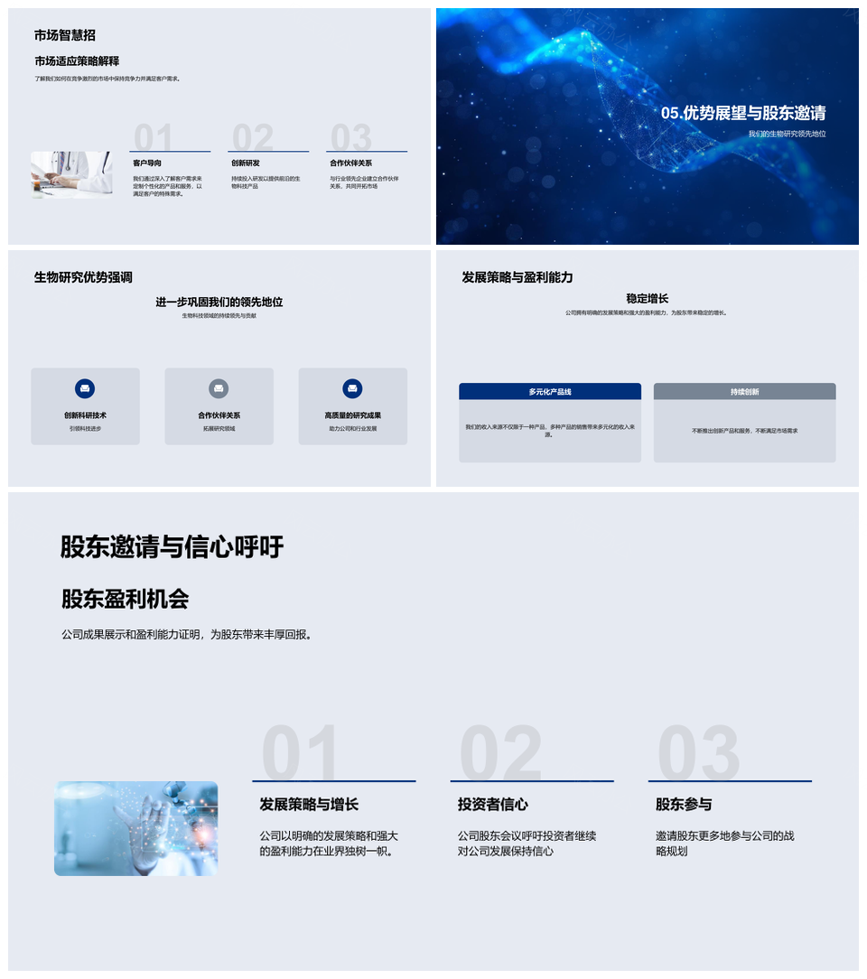 这是一张生物科技年报主导产品市场策略财务成果应用PPT模板,包含生物科技、年报、主导产品、市场策略、财务成果、应用等主题内容,也可用作生物科技年报主导产品市场策略、年报主导产品市场策略财务成果、主导产品市场策略财务成果应用、生物科技年报市场策略财务成果、生物科技年报主导产品财务成果、生物科技主导产品市场策略财务成果、年报主导产品财务成果应用、生物科技年报主导产品、年报主导产品市场策略、主导产品市场策略财务成果、市场策略财务成果应用、生物科技年报市场策略、年报市场策略财务成果、主导产品财务成果应用、生物科技年报等PPT场景使用。 风云办公提供的生物科技年报主导产品市场策略财务成果应用PPT模板,下载格式为pptx,一共23页,作品中文字及图均可以修改和编辑,图片更改请在作品中右键图片并更换,文字修改请直接点击文字进行修改。