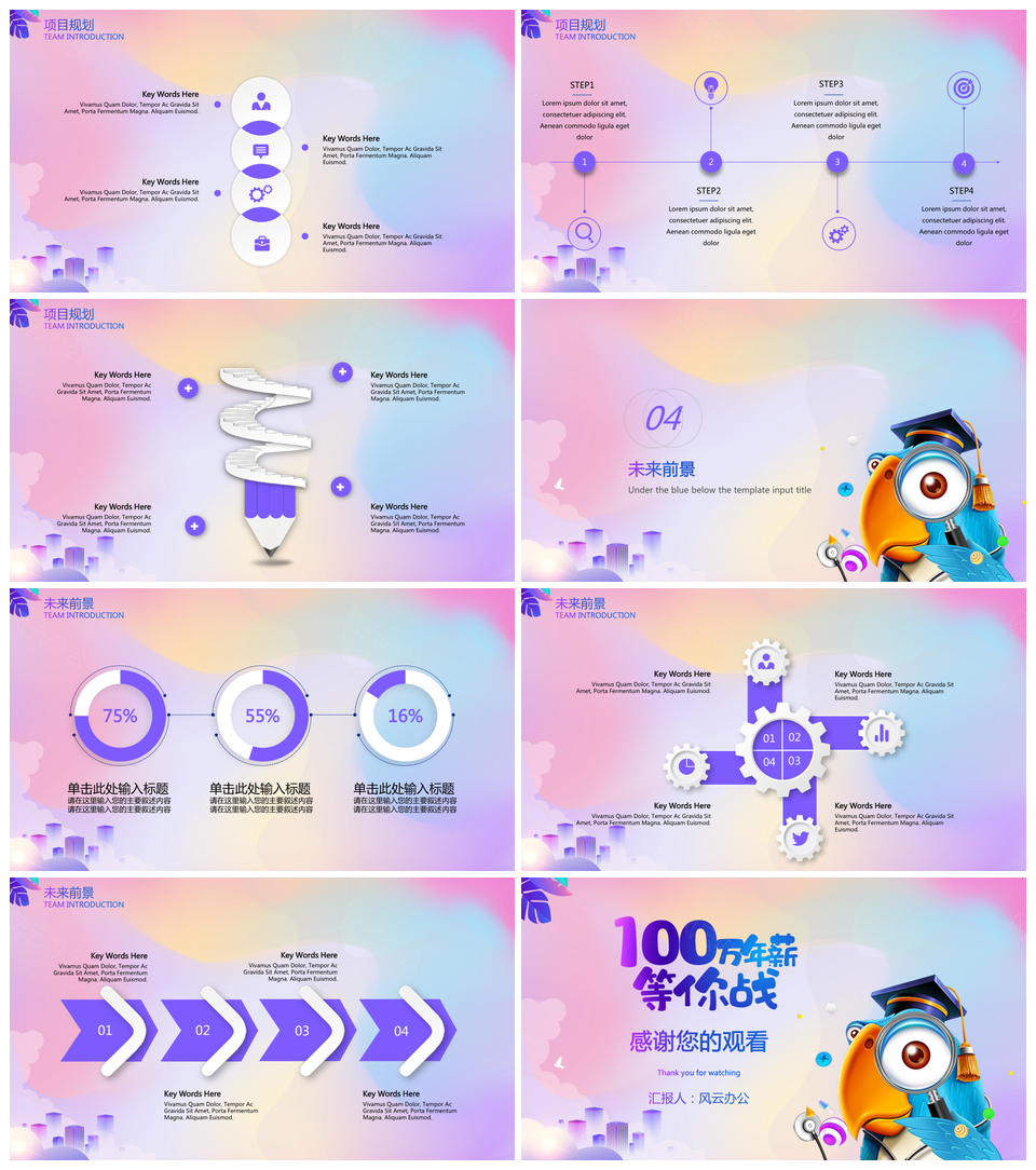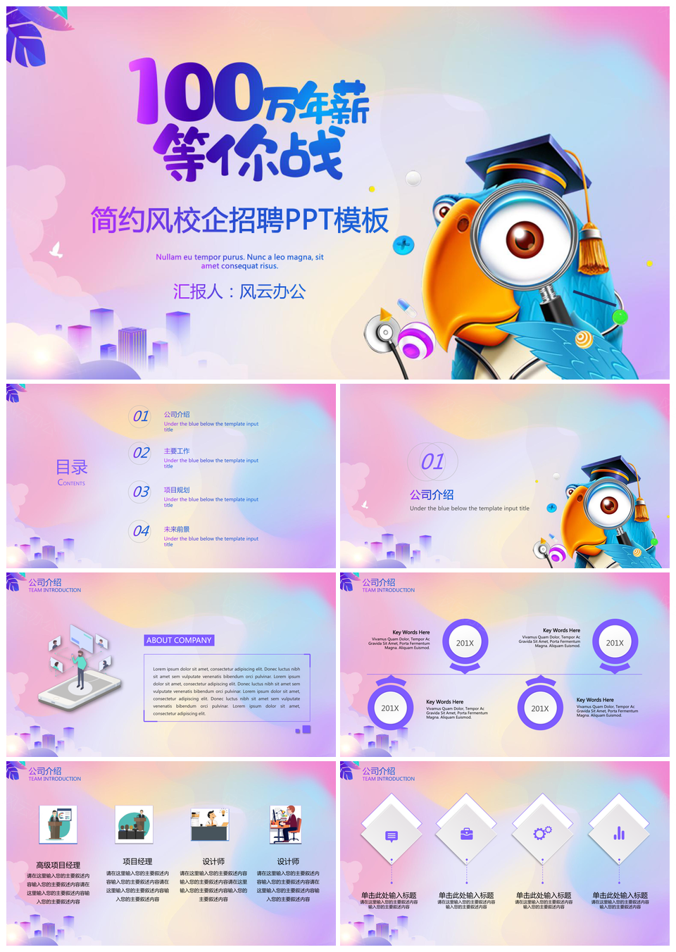 这是一张渐变简约风校企招聘PPT模板,包含渐变、简约风、校企、招聘等主题内容,也可用作渐变、简约、校企、招聘 渐变简约校企招聘、简约校企招聘、校企招聘渐变简约、校企招聘、渐变简约、简约校企、渐变校企、校企简约招聘等PPT场景使用。 风云办公提供的渐变简约风校企招聘PPT模板,下载格式为pptx,一共20页,作品中文字及图均可以修改和编辑,图片更改请在作品中右键图片并更换,文字修改请直接点击文字进行修改。