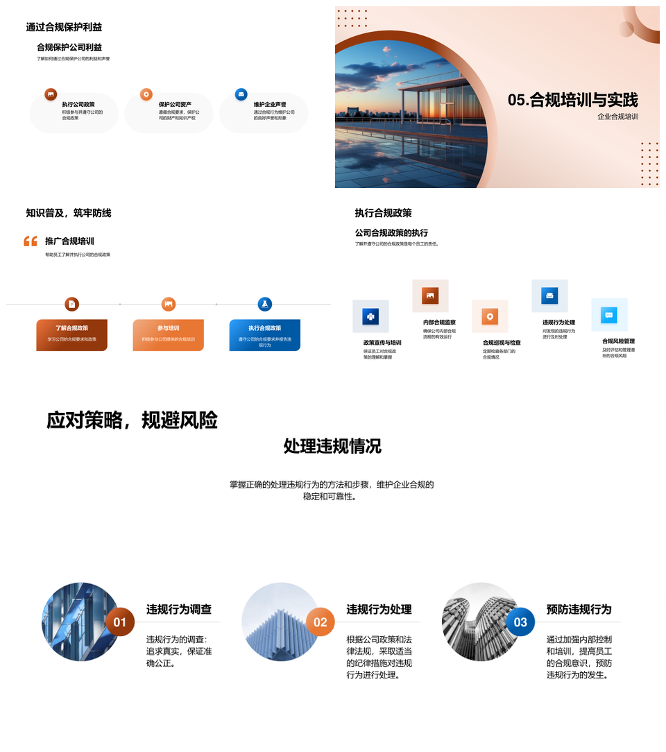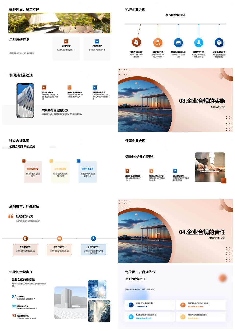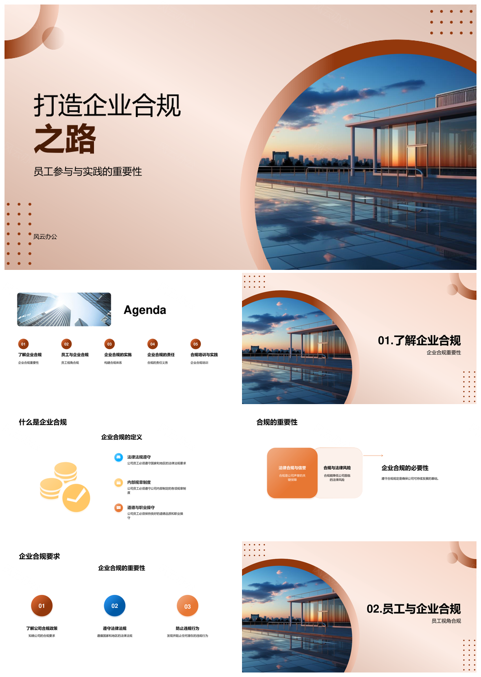 风云办公提供的企业合规需员工参与培训防违规PPT模板,下载格式为pptx,一共23页,作品中文字及图均可以修改和编辑,图片更改请在作品中右键图片并更换,文字修改请直接点击文字进行修改。