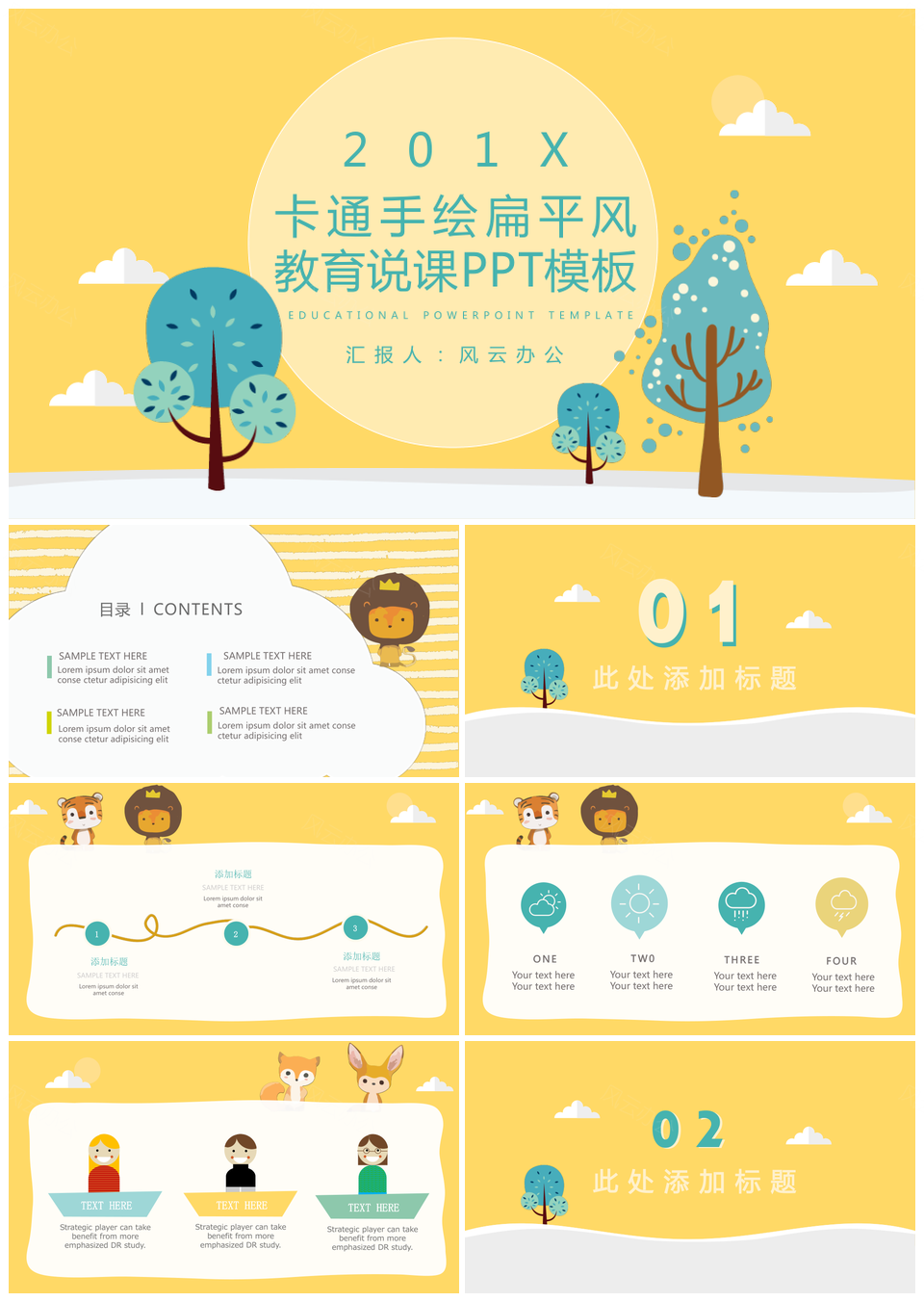 风云办公提供的卡通手绘扁平风教育说课PPT模板,下载格式为pptx,一共20页,作品中文字及图均可以修改和编辑,图片更改请在作品中右键图片并更换,文字修改请直接点击文字进行修改。