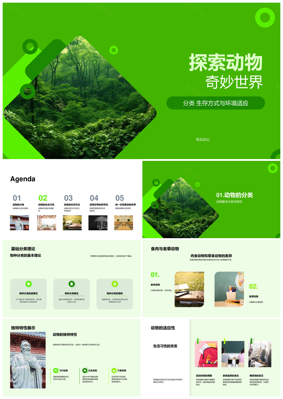 风云办公提供的探秘动物分类食肉食草生存丛林适应PPT模板,下载格式为pptx,一共33页,作品中文字及图均可以修改和编辑,图片更改请在作品中右键图片并更换,文字修改请直接点击文字进行修改。