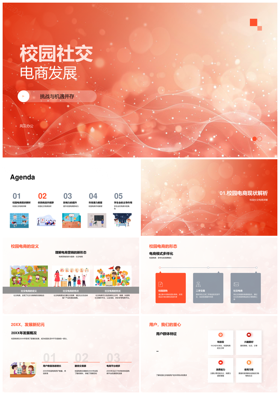 风云办公提供的校园社交电商发展机遇挑战与策略PPT模板,下载格式为pptx,一共29页,作品中文字及图均可以修改和编辑,图片更改请在作品中右键图片并更换,文字修改请直接点击文字进行修改。