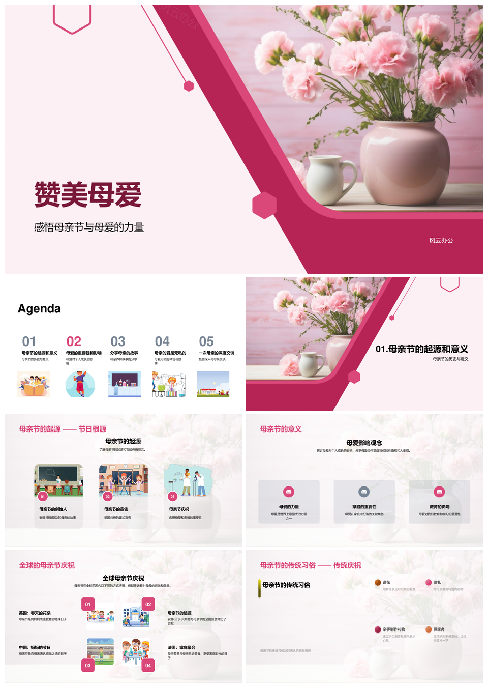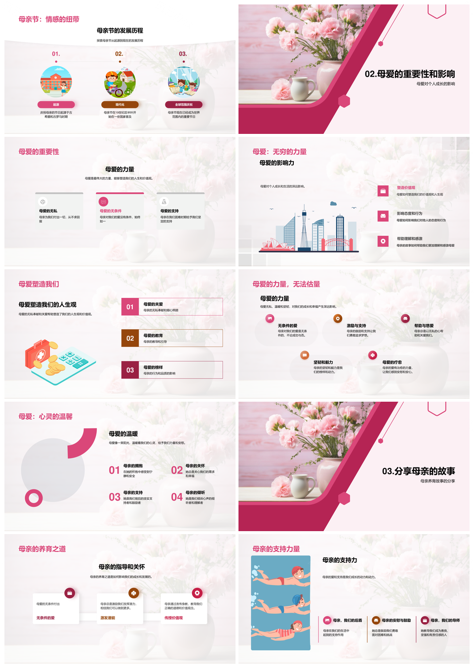 风云办公提供的母爱力量母亲节育童粉康乃馨PPT模板,下载格式为pptx,一共33页,作品中文字及图均可以修改和编辑,图片更改请在作品中右键图片并更换,文字修改请直接点击文字进行修改。