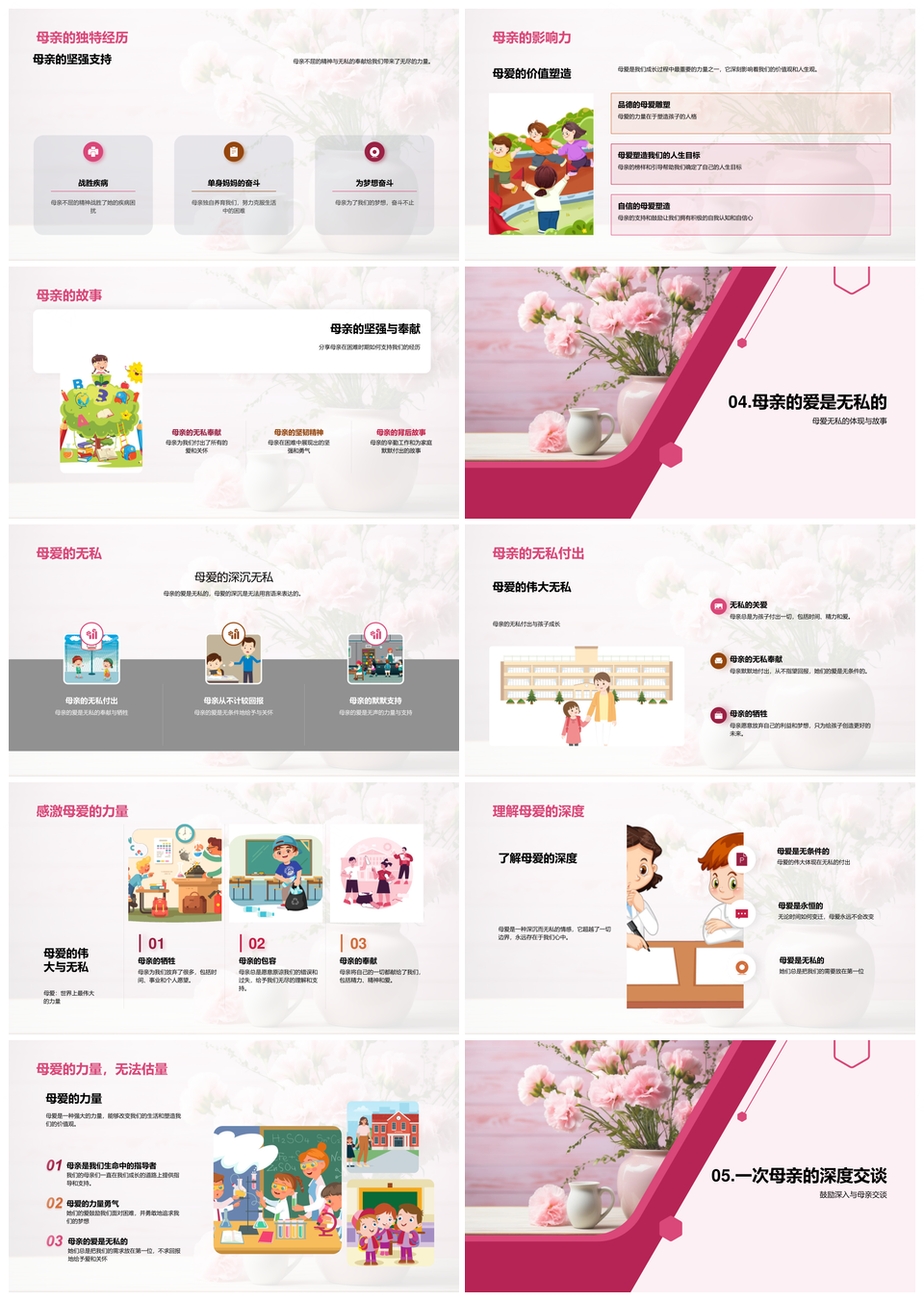 这是一张母爱力量母亲节育童粉康乃馨PPT模板,包含母爱、力量、母亲、节、育童粉、康乃馨等主题内容,也可用作母爱力量母亲节康乃馨、母爱力量康乃馨、母爱母亲节康乃馨、母亲节康乃馨母爱力量、母爱力量母亲节、母亲节母爱力量康乃馨、母亲节育童康乃馨、母爱育童康乃馨、力量母亲节康乃馨、母爱力量育童、育童康乃馨母爱、母爱康乃馨育童、母爱母亲节育童、母亲节育童母爱、母亲节康乃馨力量等PPT场景使用。