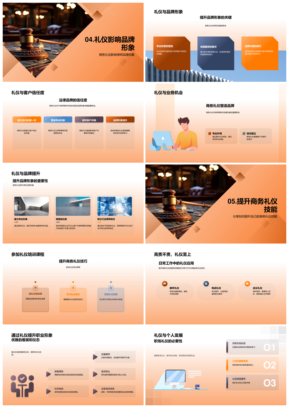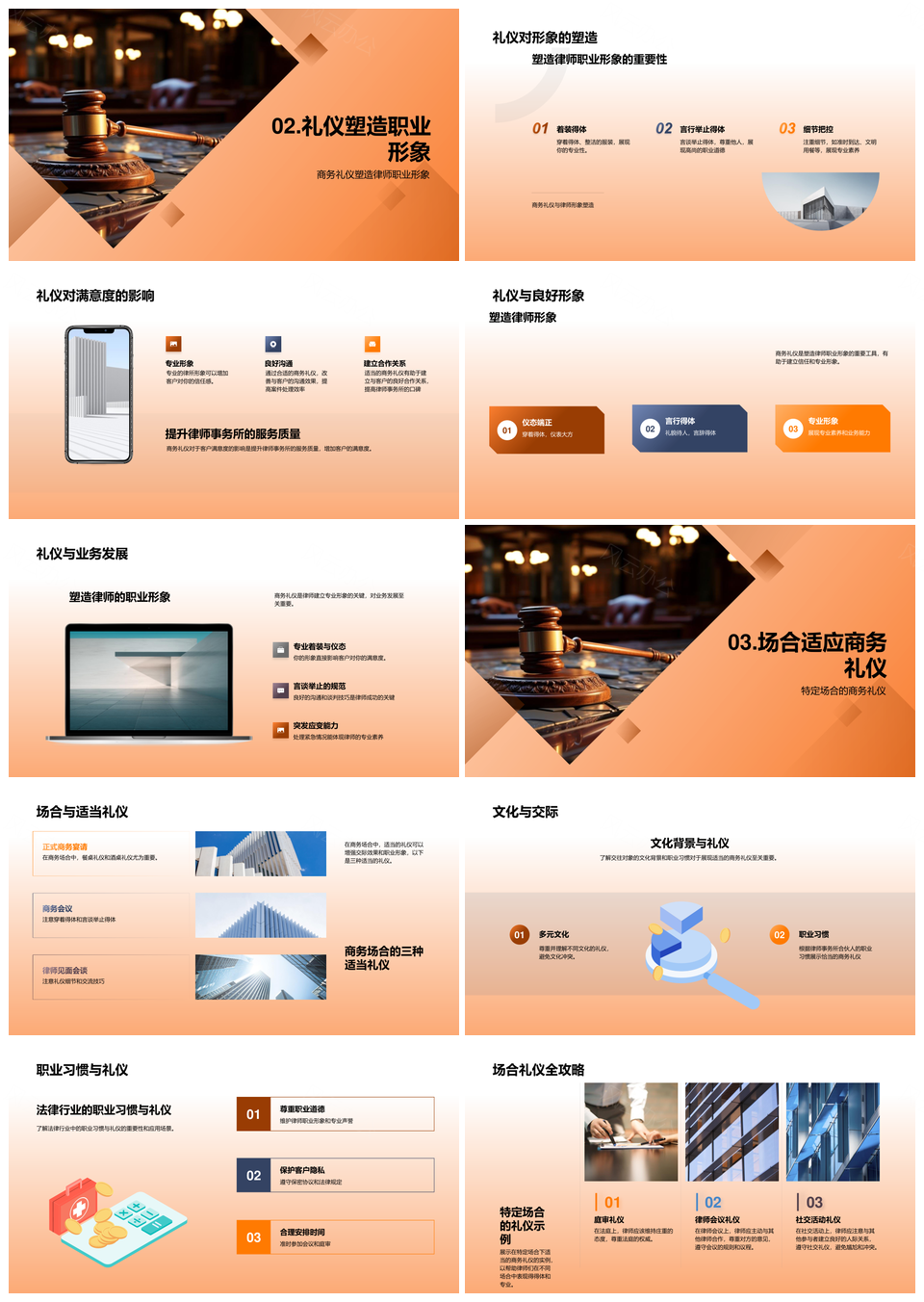 这是一张律师商务礼仪培训助力律所职业形象业务发展PPT模板,包含律师、商务礼仪、培训、助力、律所、职业形象、业务、发展等主题内容,也可用作律师商务礼仪培训、商务礼仪培训助力、礼仪培训助力律所、培训助力律所职业、助力律所职业形象、律所职业形象业务、职业形象业务发展、律师商务礼仪助力、律师商务助力律所、律师礼仪培训律所、商务礼仪律所职业、礼仪助力职业形象、培训律所业务发展、律师职业形象发展、商务形象业务发展等PPT场景使用。 风云办公提供的律师商务礼仪培训助力律所职业形象业务发展PPT模板,下载格式为pptx,一共28页,作品中文字及图均可以修改和编辑,图片更改请在作品中右键图片并更换,文字修改请直接点击文字进行修改。