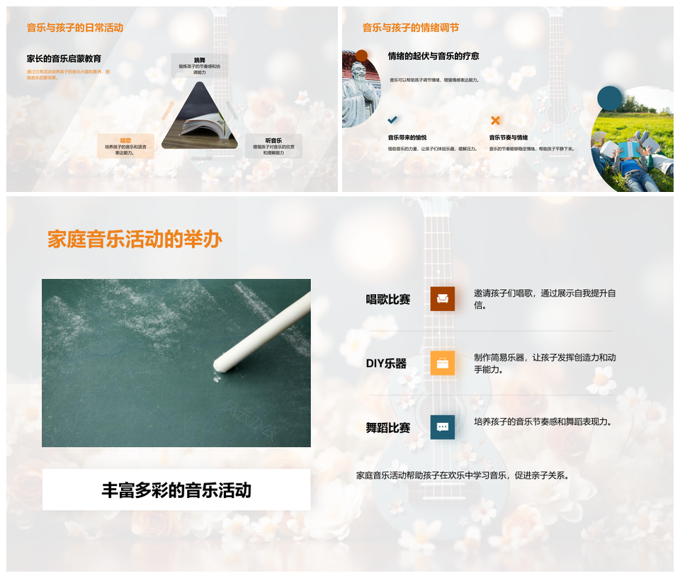 风云办公提供的音乐启蒙助孩子智创情社成长PPT模板,下载格式为pptx,一共31页,作品中文字及图均可以修改和编辑,图片更改请在作品中右键图片并更换,文字修改请直接点击文字进行修改。