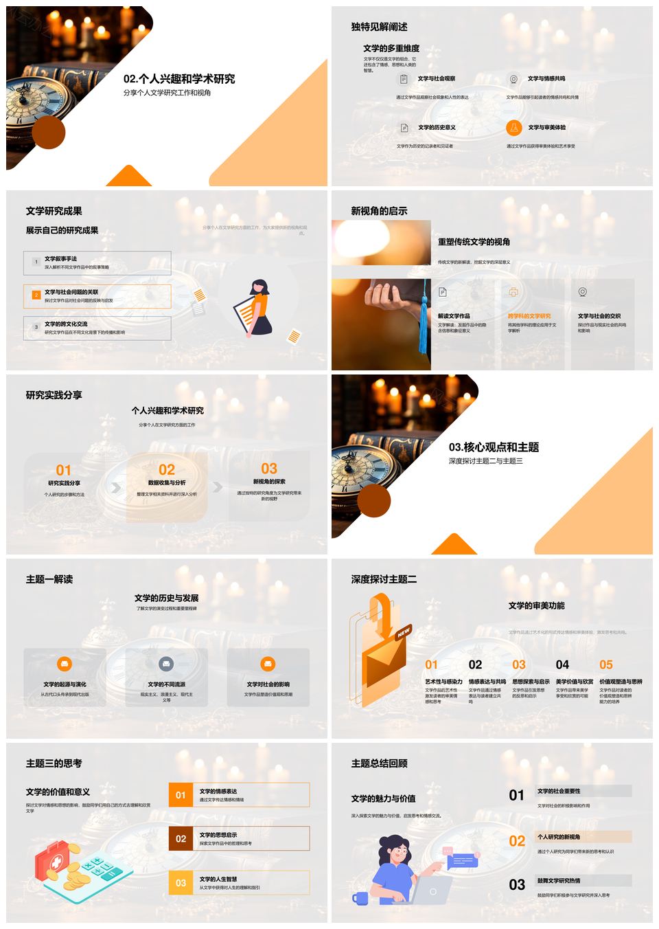 风云办公提供的文学时空漫游理论实践与钟表学术探索PPT模板,下载格式为pptx,一共28页,作品中文字及图均可以修改和编辑,图片更改请在作品中右键图片并更换,文字修改请直接点击文字进行修改。
