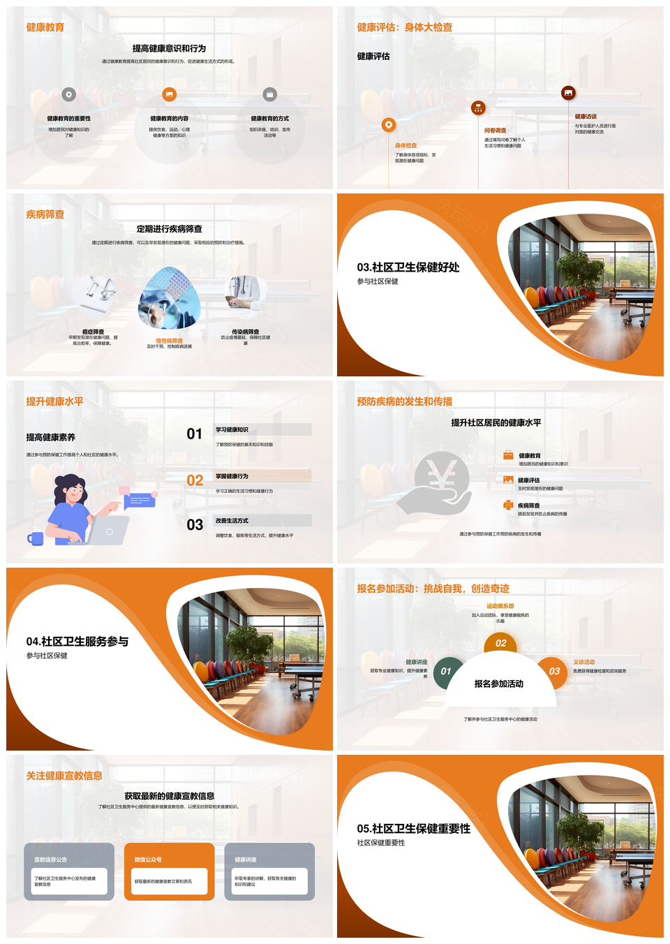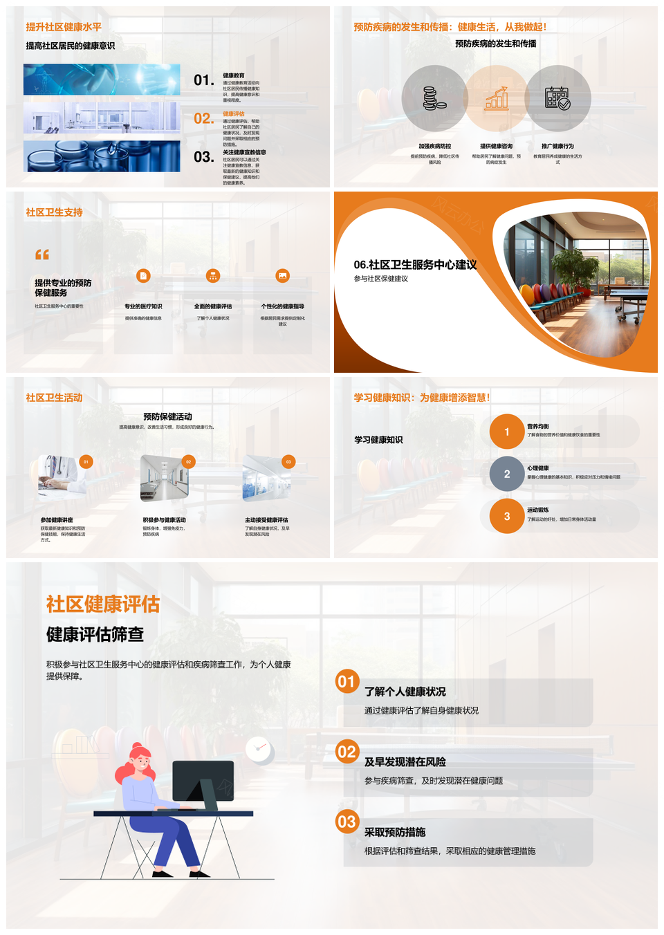 风云办公提供的健康社区共建预防保健在行动PPT模板,下载格式为pptx,一共25页,作品中文字及图均可以修改和编辑,图片更改请在作品中右键图片并更换,文字修改请直接点击文字进行修改。