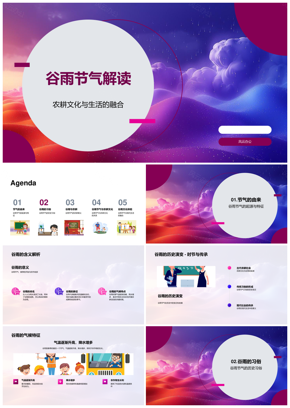 风云办公提供的谷雨农耕文化历史气候播种节气解析PPT模板,下载格式为pptx,一共23页,作品中文字及图均可以修改和编辑,图片更改请在作品中右键图片并更换,文字修改请直接点击文字进行修改。