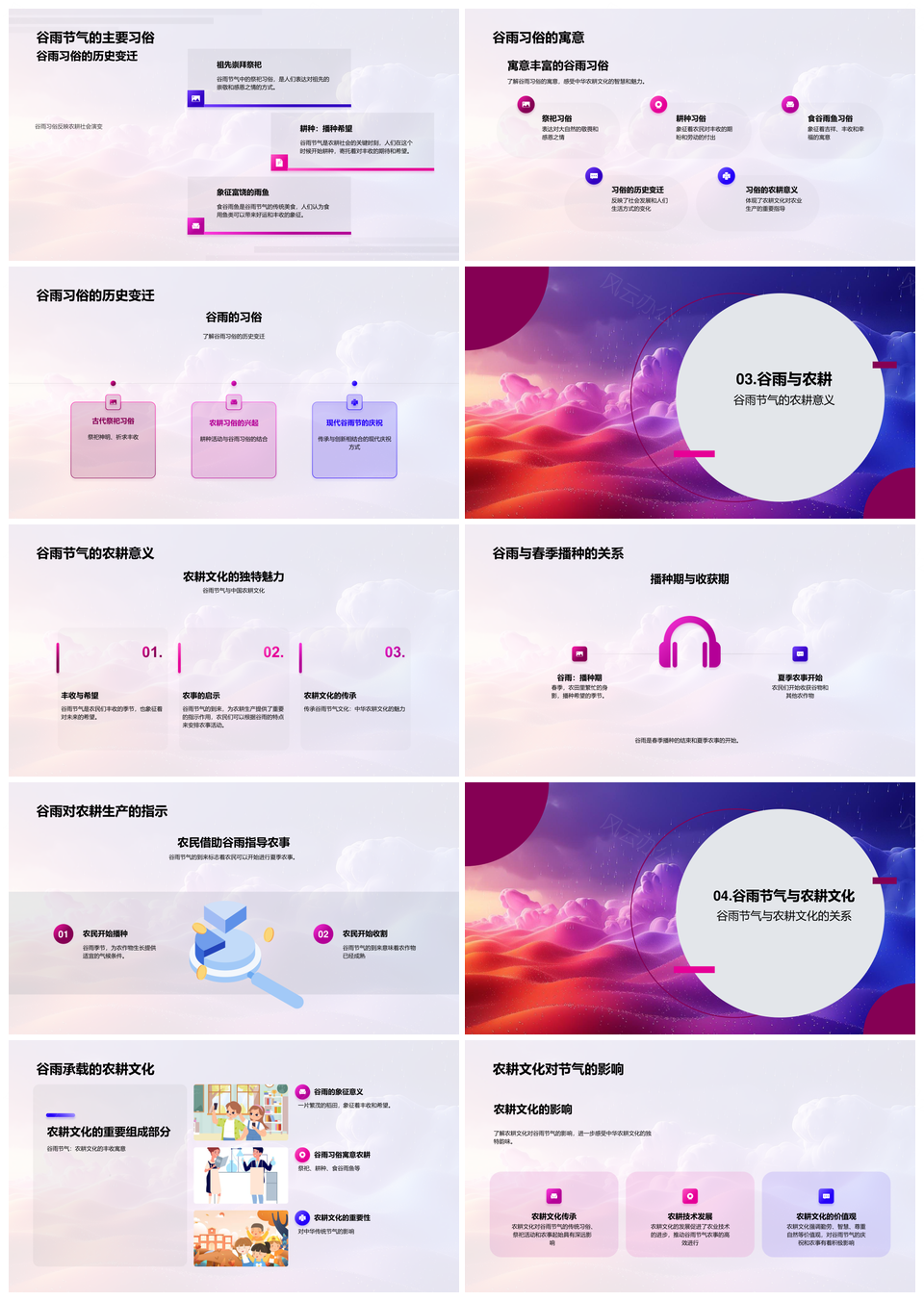 这是一张谷雨农耕文化历史气候播种节气解析PPT模板,包含谷雨、农耕文化、历史、气候、播种、节气、解析等主题内容,也可用作谷雨农耕文化历史气候、农耕文化历史气候播种、气候播种节气解析谷雨、谷雨农耕文化历史、农耕文化历史气候、文化历史气候播种、历史气候播种节气、气候播种节气解析、谷雨农耕文化、农耕文化历史、文化历史气候、历史气候播种、气候播种节气、播种节气解析、节气解析谷雨等PPT场景使用。
